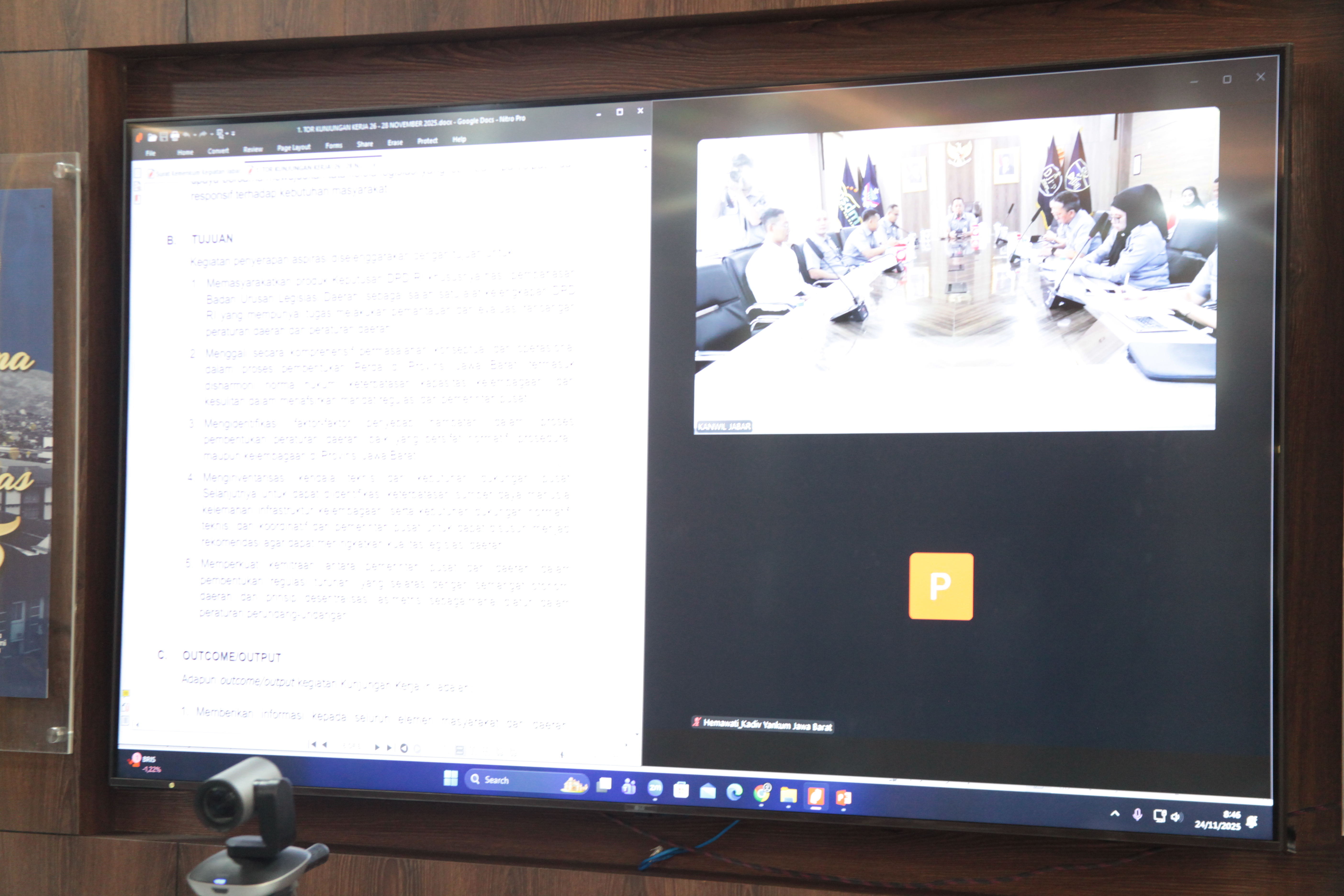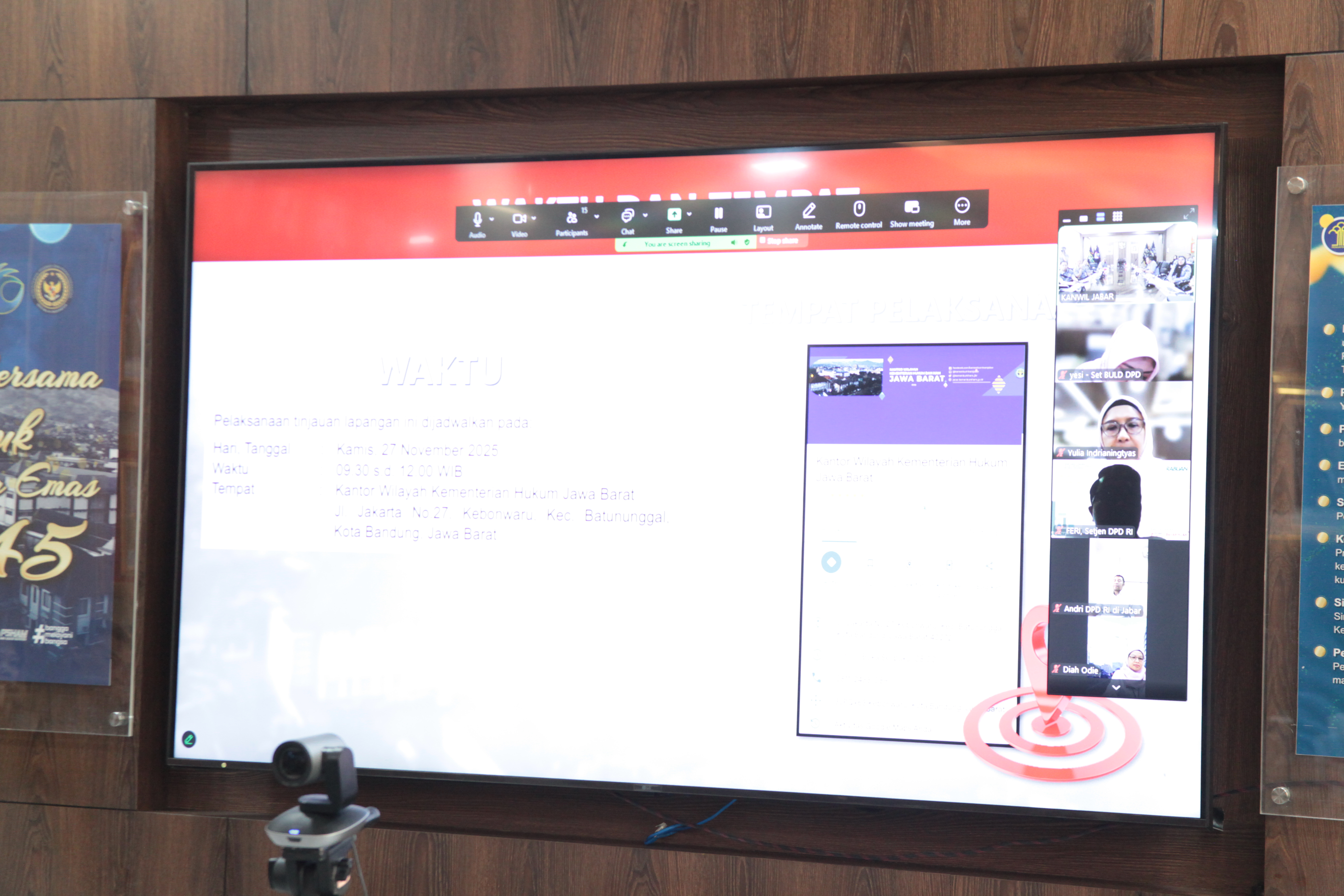 Dalam rapat persiapan teknis, pihak Kemenkum Jabar juga memaparkan kesiapan layout ruangan yang akan menggunakan format U-shape untuk mendukung diskusi yang interaktif, serta pengaturan alur kedatangan tamu VIP dan rombongan. Kegiatan ini rencananya tidak hanya dihadiri oleh pihak internal Kemenkum dan DPD RI, tetapi juga turut mengundang perwakilan dari Kementerian Dalam Negeri, Pemerintah Provinsi Jawa Barat, DPRD, serta pemerintah daerah dari Kabupaten Bandung Barat, Kabupaten Bandung, Sumedang, Cimahi, dan Kota Bandung. Diskusi nanti akan difokuskan pada inventarisasi masalah pembentukan produk hukum daerah, di mana Kemenkum Jabar siap memberikan tanggapan dan masukan konstruktif demi terciptanya harmonisasi hukum yang berkualitas di Tanah Pasundan.