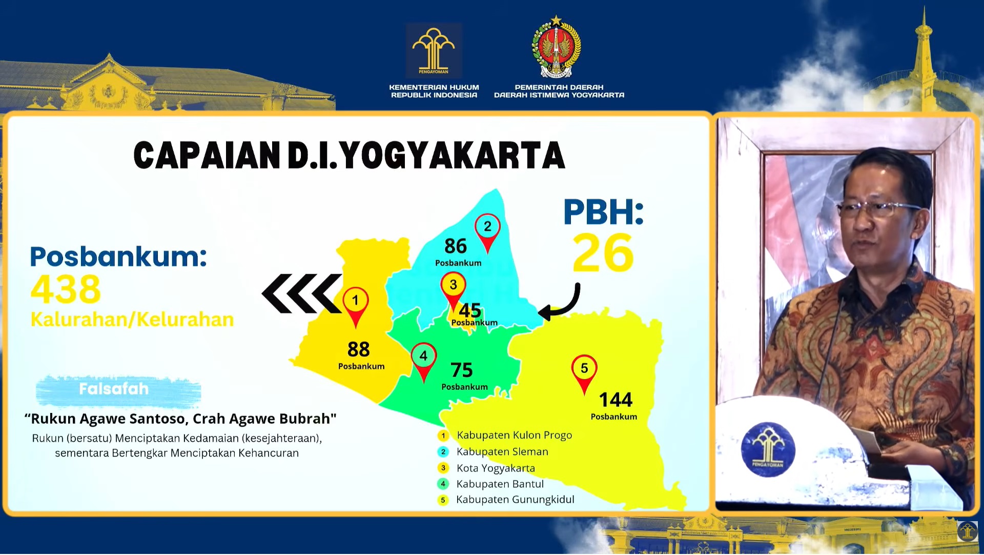 Gubernur DIY, Sri Sultan Hamengkubuwono X, dalam sambutannya menekankan falsafah "menang tanpa ngasorake" atau menang tanpa merendahkan, yang menjadi jiwa dari keberadaan Posbankum ini. Keadilan harus bersifat humanis dan menjaga martabat warga negara. Menutup rangkaian acara, Menteri Hukum memberikan piagam penghargaan kepada para bupati dan walikota atas komitmen mereka dalam membentuk Posbankum. Semangat kolaborasi ini diharapkan dapat menular ke berbagai wilayah lain, termasuk di Jawa Barat, di mana Kemenkum Jabar berkomitmen untuk terus bersinergi dengan pemerintah daerah guna membangun ekosistem hukum desa yang berkelanjutan dan berkeadilan.