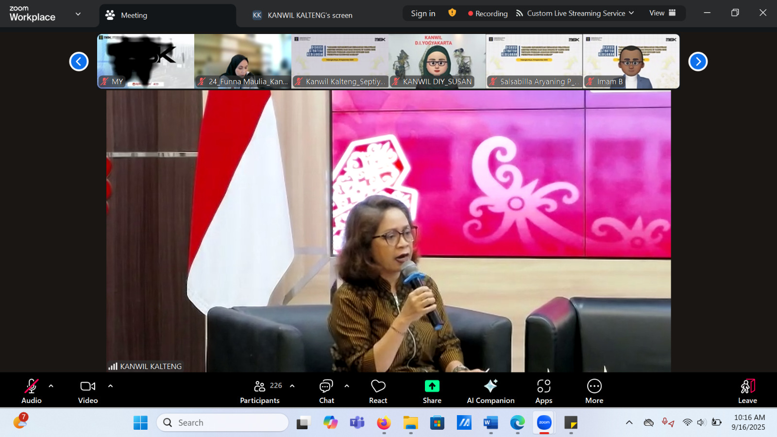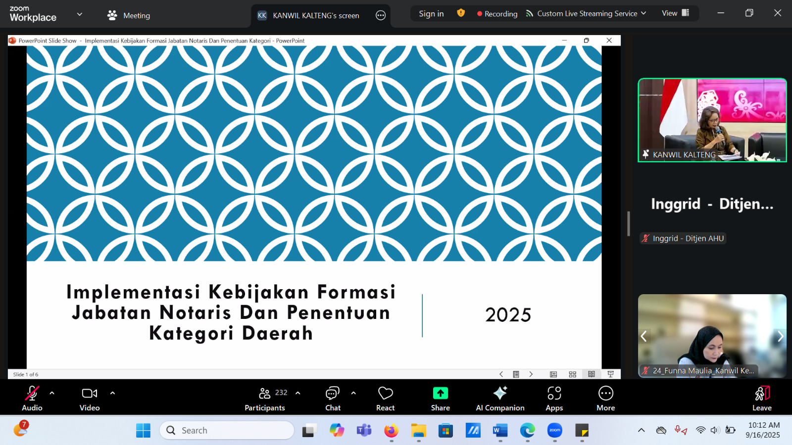 BANDUNG –Kantor Wilayah Kemenkum Jawa Barat mengikuti Diskusi Strategi Kebijakan (DSK) yang diselenggarakan oleh Kanwil Kemenkum Kalimantan Tengah secara daring via Zoom Meeting dan Youtube, Selasa (16/9/2025). Kehadiran ini merupakan tindak lanjut atas arahan Kepala Kantor Wilayah Kemenkum Jawa Barat, Asep Sutandar, yang menugaskan Kepala Divisi Peraturan Perundang-Undangan dan Pembinaan Hukum, Funna Maulia Massaile, beserta Tim BSK Kanwil Jabar untuk berpartisipasi aktif.