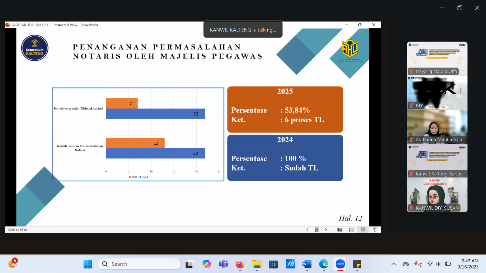 Dalam paparan diskusi, terungkap permasalahan signifikan yang terjadi di Kalimantan Tengah. Kadivyankum Kanwil Kalteng menyoroti bahwa Permenkum 19/2021 membuat dampak kebijakan kurang optimal karena kewenangan Kanwil terbatas hanya pada pembinaan dan pengawasan. Sementara itu, kewenangan pengajuan formasi notaris berada di tangan Menteri melalui Ditjen AHU berdasarkan masukan organisasi notaris daerah.