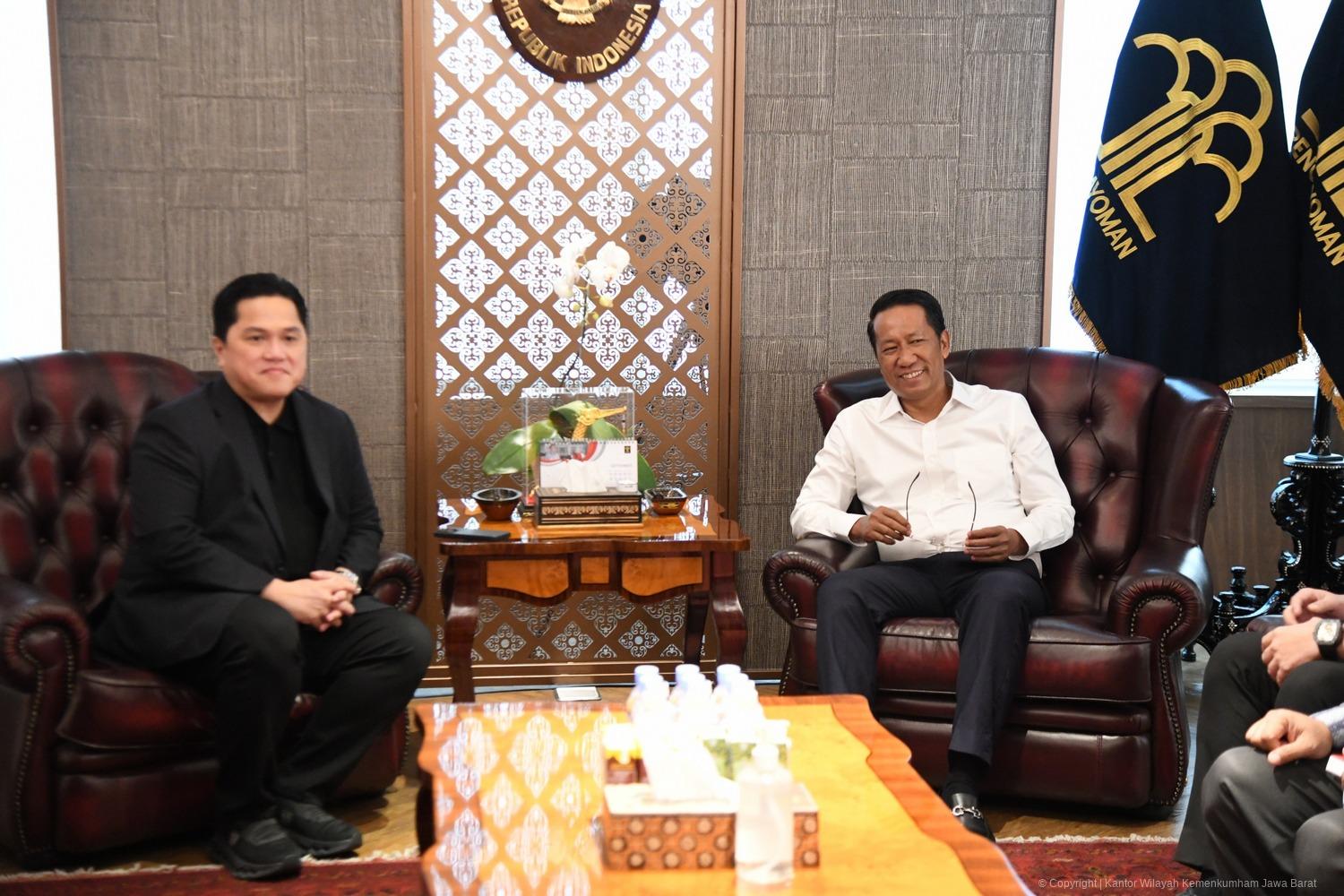 “Pak Erick tadi melaporkan beberapa hal, terkait PSSI maupun Perbasi. Alhamdulillah beliau menyampaikan (tentang) pemberian dukungan yang optimal pada seluruh talenta-talenta (atlet) yang bisa mengangkat nama baik Republik Indonesia di kancah internasional, (khususnya) di dua cabang olahraga tersebut,” kata menkumham di Press Room Kemenkumham.