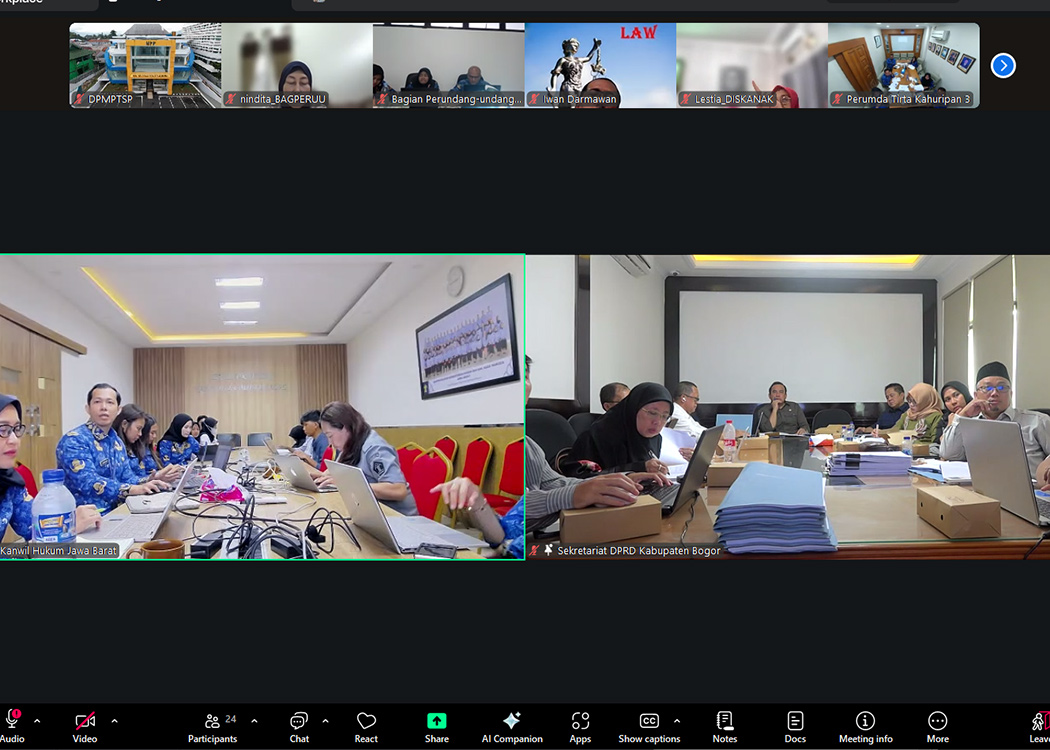 BANDUNG - Kantor Wilyah Kementerian Hukum Jawa Barat (Kanwil Kemenkum Jabar) melalui Divisi P3H pada siang hari ini melaksanakan Rapat Harmonisasi terhadap 2 Rancangan Peraturan Daerah (Raperda) Kabupaten Bogor bersama DPRD Kab. Bogor dan Pemerintah Kab. Bogor secara daring (hybrid) (Senin, 10/11/2025).