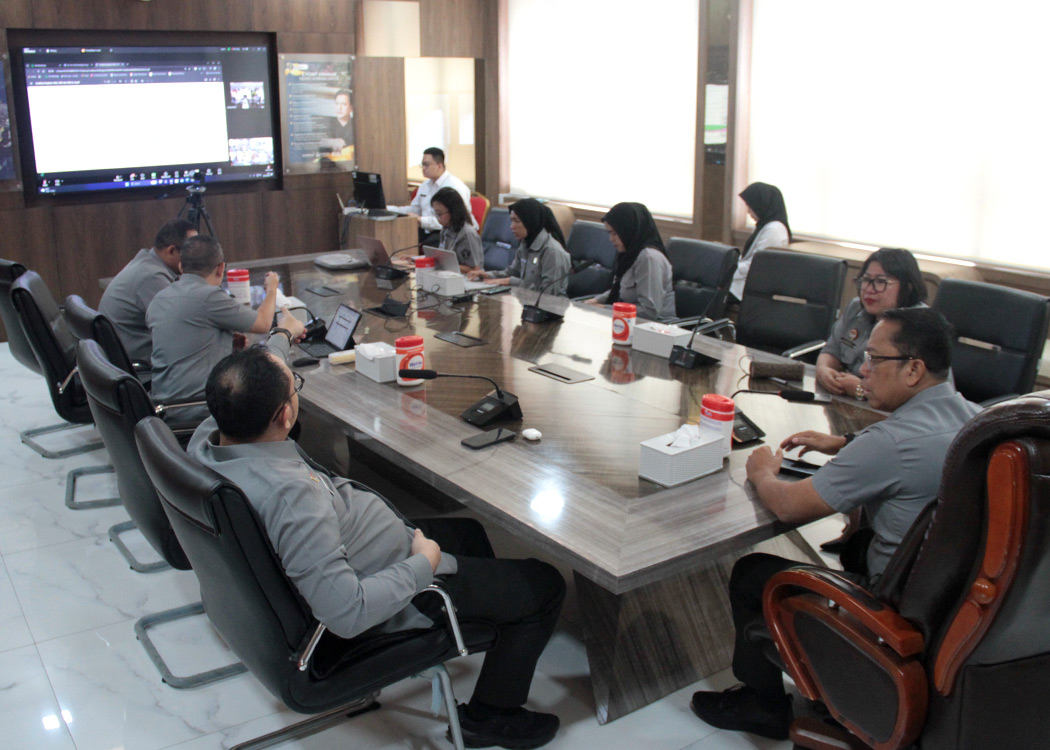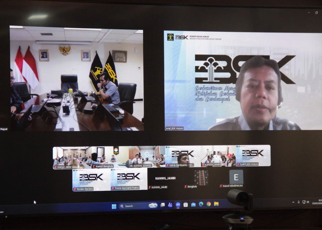 Dari ruang rapat Sahardjo, Kanwil Jabar, Kepala Kantor Wilayah Asep Sutandar bersama Kepala Divisi P3H Ferry Gunawan, Kepala Divisi Pelayanan Hukum Hemawati BR Pandia, beserta tim kerja BSK Kanwil Jabar mengikuti sosialisasi terkait pedoman pelaksanaan survei yang disampaikan oleh tim BSK Hukum pusat.