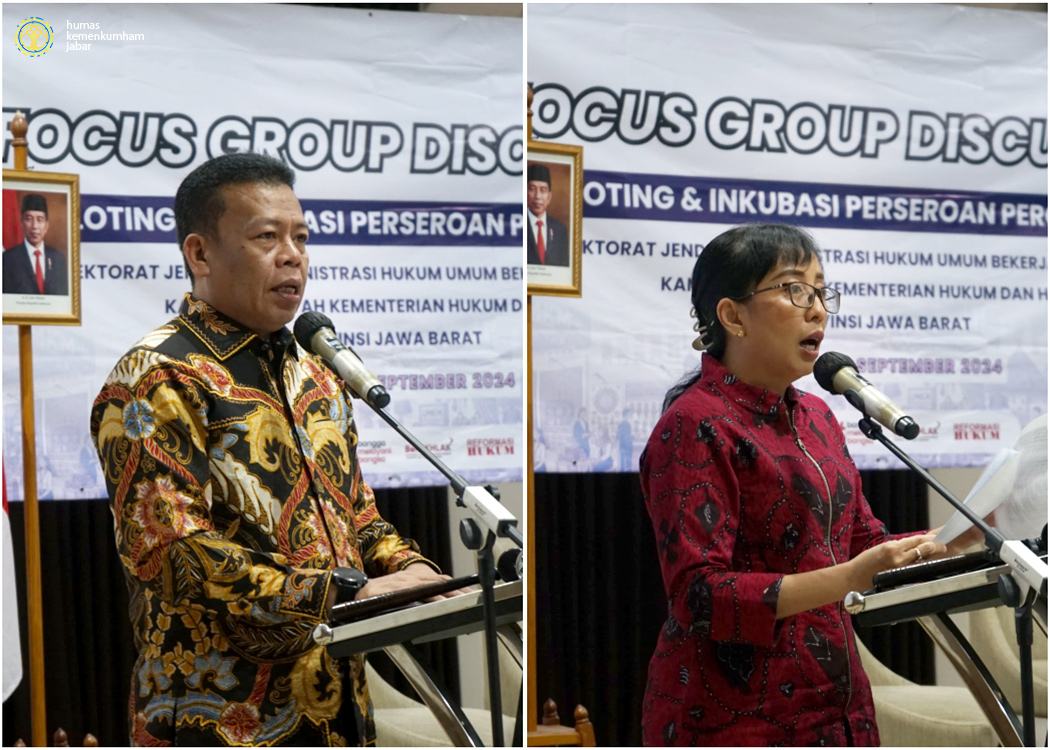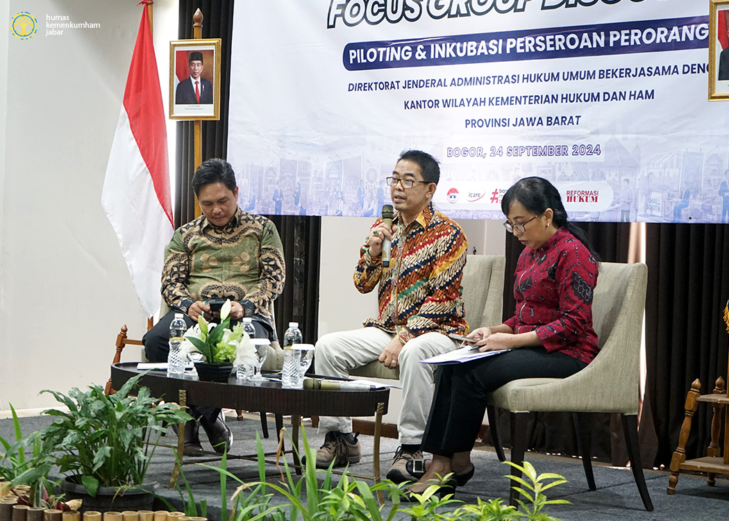 Bogor - Direktorat Jenderal Administrasi Hukum Umum (AHU) bekerjasama dengan Kantor Wilayah Kemenkumham Jabar pagi ini (Selasa, 24,/09/2024) menyelenggarakan Focus Group Discussion (FGD) Piloting dan Inkubasi Perseroan Perseorangan dengan mengambil tema “Peningkatan Layanan Perseroan Perseorangan” yang diadakan di Royal Padjajaran Jl. Raya Padjajaran No.12 Bogor dan diikuti oleh 50 (lima puluh) orang yang terdiri dari pelaku usaha Perseroan Perorangan dan pelaku UMKM, wilayah Kota Bogor serta pegawai pada Kantor Wilayah Kementerian Hukum dan HAM Jawa Barat.