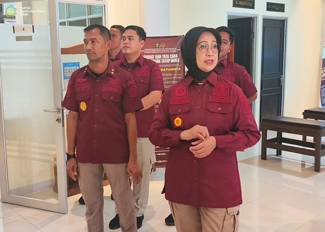 Gusti Ayu didampingi penanggung jawab Jawa Barat Dimas dan Kepala Bidang HAM Kanwil Jawa Barat Hasbullah Fudail secara langsung melihat dan mencoba berbagai fasilitas pelayanan publik berbasis HAM khususnya kelompok disabilitas/rentang di lingkungan Lapas seperti guiding block, jalan kemiringan, toilet disabilitas, ruang laktasi, tempat bermain anak, tahanan perempuan & lansia, serta fasilitas ibadah.