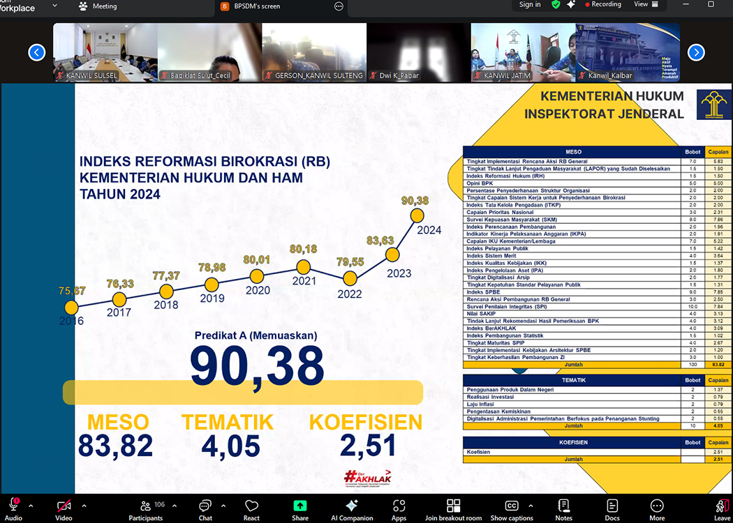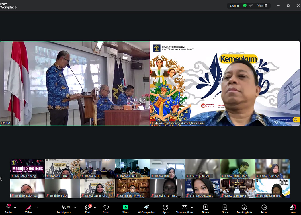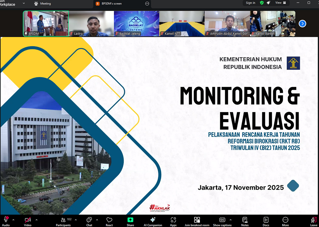 BANDUNG – Kantor Wilayah Kementerian Hukum Jawa Barat (Kanwil Kemenkum Jabar) pada pagi hari ini mengikuti jalannya kegiatan rapat Monitoring dan Evaluasi (Monev) Pelaksanaan Rencana Kerja Tahunan Reformasi Birokrasi (RKT RB) Triwulan IV (B12) Tahun 2025 yang diselenggarakan oleh Sekretariat Jenderal dan Inspektorat Jenderal Kemenkum RI secara daring melalui Zoom Meeting (Senin, 17/11/2025).