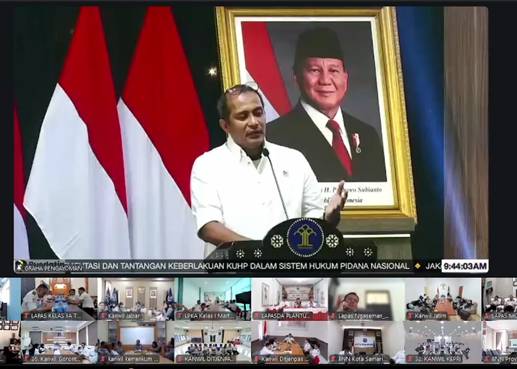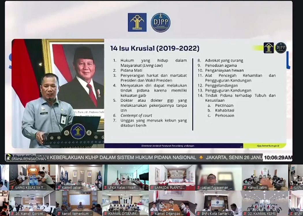 Bertema “Implementasi dan Tantangan Keberlakuan KUHP dalam Sistem Hukum Pidana Nasional”, kegiatan yang berpusat di Graha Pengayoman, Jakarta, ini diikuti secara daring oleh para pegawai di lingkungan Kemenkum, Kementerian Imigrasi dan Pemasyarakatan, serta kementerian dan lembaga terkait lainnya.