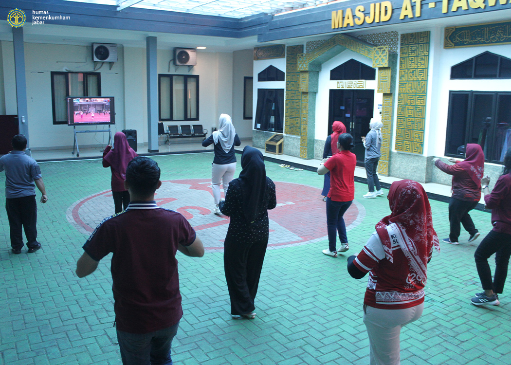 Selama hampir setengah jam lebih Kepala Divisi Administrasi Itun Wardatul Hamro beserta para pegawai Kanwil Kemenkumham Jabar pada halaman masjid At-Taqwa, Kanwil Jabar, melaksanakan olahraga senam pagi bersama mengikuti gerakan yang diperagakan oleh instruktur senam di pusat. Kegiatan senam pagi bersama ini juga diikuti secara daring oleh Satuan Kerja Kemenkumham se-Indonesia.