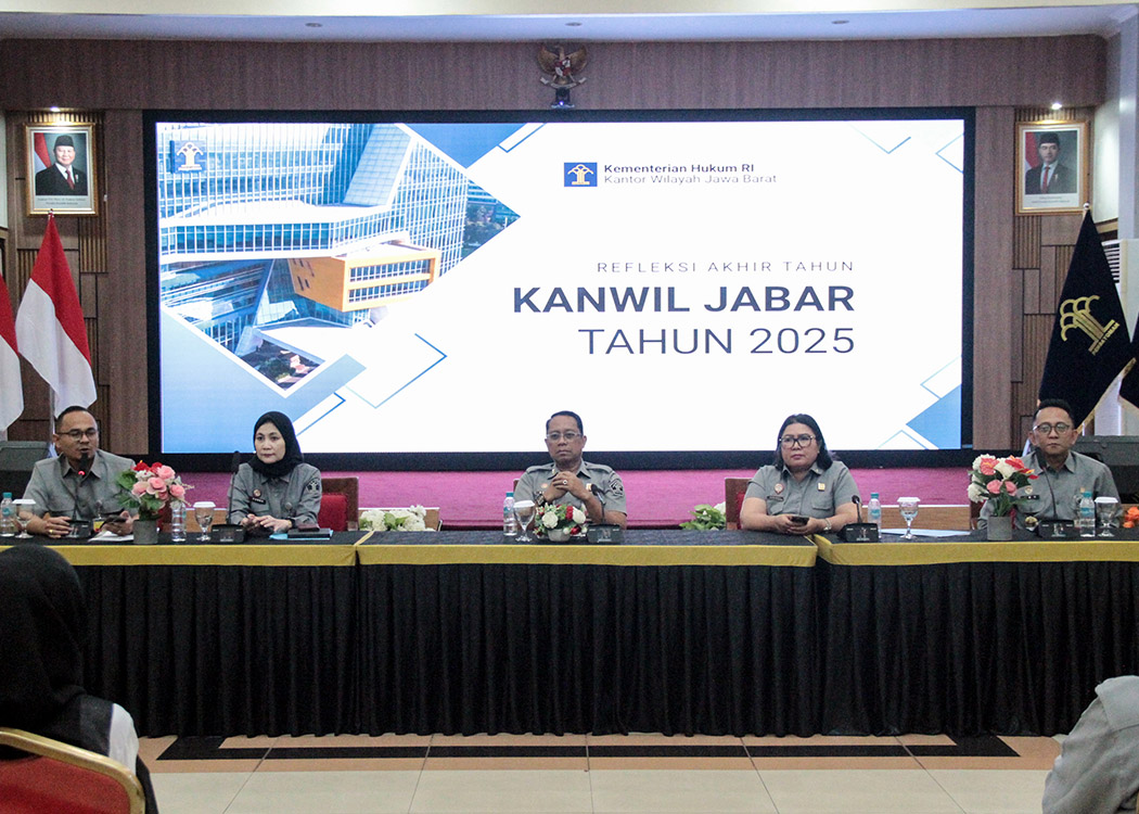 BANDUNG – Kanwil Kemenkum Jabar menyelenggarakan kegiatan Refleksi Akhir Tahun 2025 pada Selasa, 23 Desember 2025, bertempat di Aula Soepomo, Bandung. Kegiatan ini dipimpin langsung oleh Kakanwil Kemenkum Jabar, Asep Sutandar, yang didampingi oleh jajaran pimpinan tinggi pratama, di antaranya Kadivyankum Jabar, Hemawati BR Pandia, KadivP3H Jabar, Funna Maulia Massaile, Kabag TU dan Umum, Archie Tigor, serta Kabid Yan KI, Ery Kurniawan.