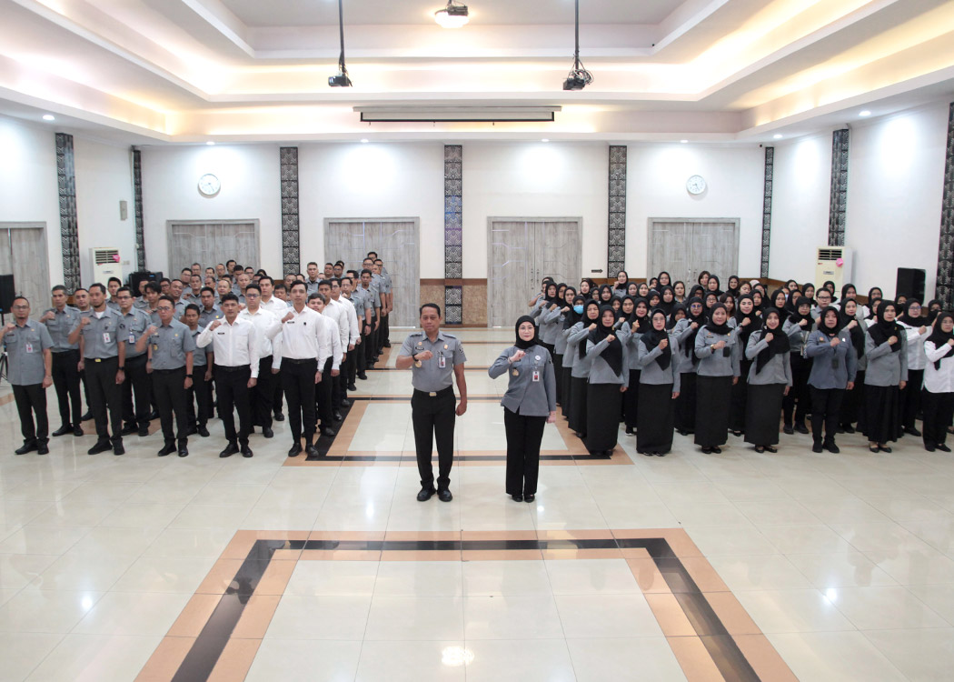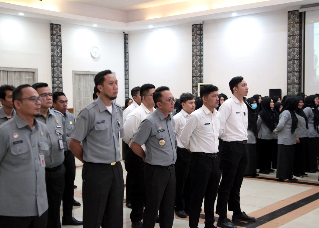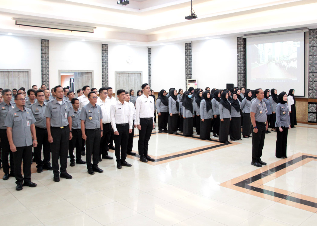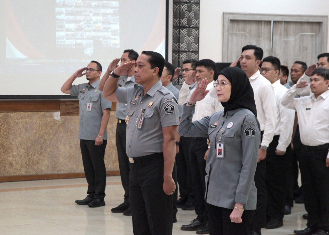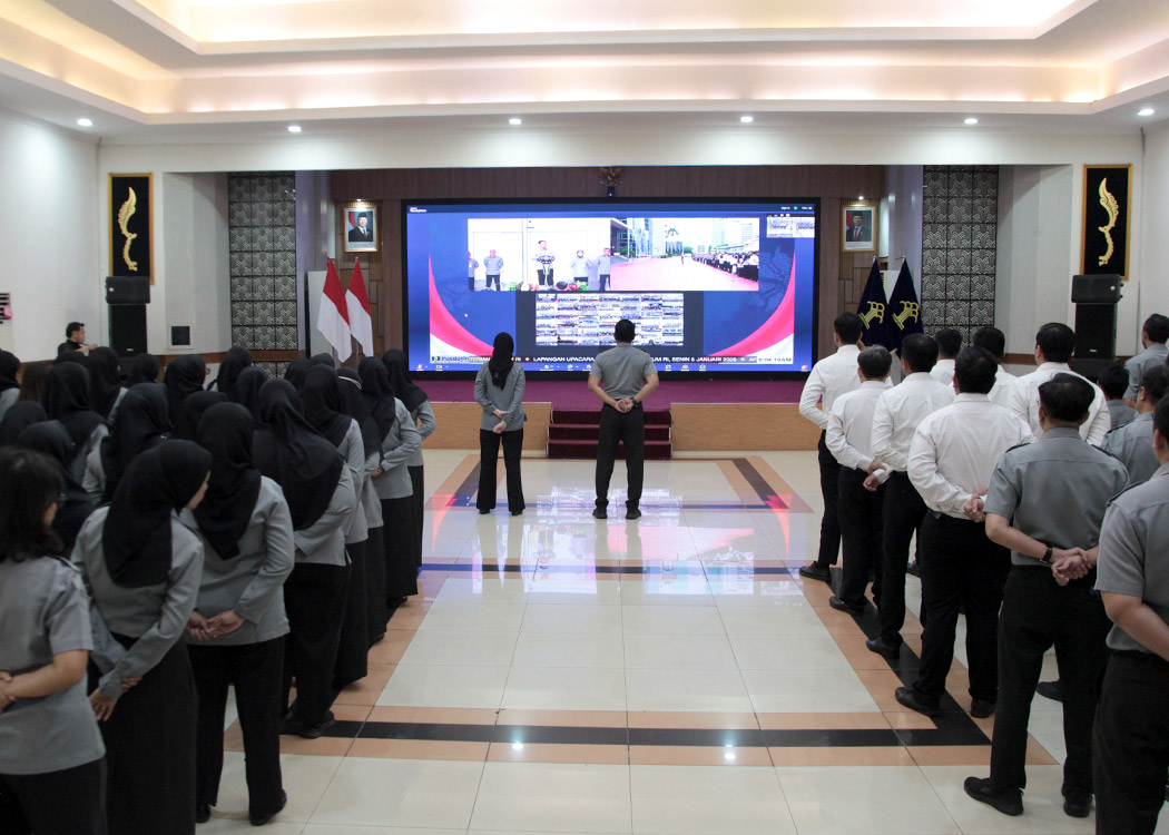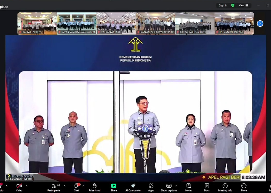 Pada aula Soepomo, Kanwil Jabar, Kepala Kantor Wilayah Asep Sutandar bersama Kepala Divisi P3H Funna Maulia Masaille dan para pegawai Kanwil Kemenkum Jabar mengikuti jalannya apel pagi bersama yang dipimpin oleh Sekretaris Jenderal Nico Afinta sebagai pembina apel.