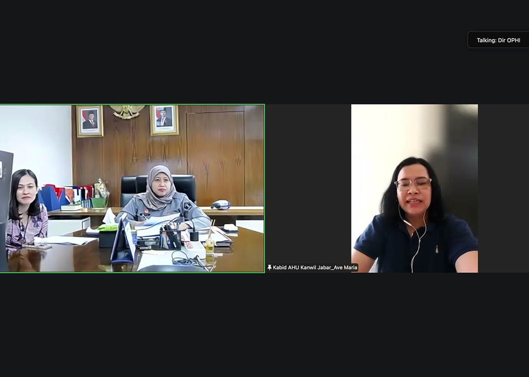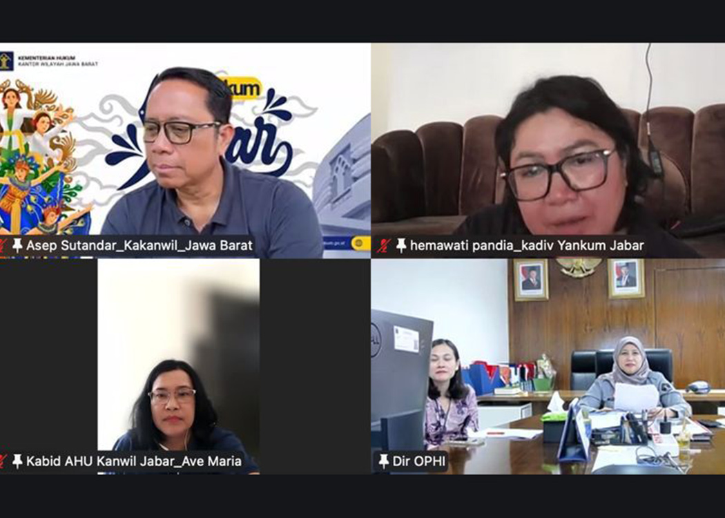 BANDUNG - Kepala Kantor Wilayah Kementerian Hukum Jawa Barat (Kakanwil Kemenkum Jabar) Asep Sutandar bersama dengan Kepala Divisi Pelayanan Hukum Hemawati BR Pandia, Kepala Divisi P3H Ferry Gunawan C., Kepala Bidang Pelayanan Administrasi Hukum Umum (AHU) Ave Maria Sihombing dan jajaran pegawai Bidang AHU mengikuti Rapat Koordinasi Pembahasan Persiapan Kunjungan Kerja DPR RI terkait Rancangan Undang-Undang tentang Hukum Perdata Internasional yang diselenggarakan oleh Otoritas Pusat dan Hukum Internasional (OPHI) Direktorat Jenderal AHU (Ditjen AHU) secara daring (Selasa, 17/03/2026).
