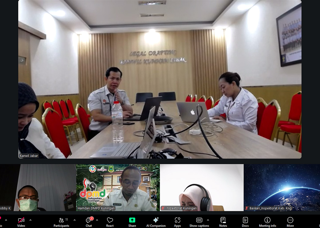 Bandung – Divisi P3H Kantor Wilayah Kementerian Hukum Jawa Barat (Kanwil Kemenkum Jabar) pada siang hari ini melaksanakan Rapat Harmonisasi atas Rancangan Peraturan Bupati (Raperbup) Kabupaten Kuningan secara virtual melalui Zoom Meeting (Rabu, 12/11/2025) .