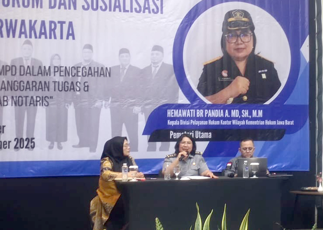 Purwakarta - Kantor Wilayah Kementerian Hukum Jawa Barat (Kanwil Kemenkum Jabar) yang diwakili oleh Kepala Divisi Pelayanan Hukum Hemawati BR Pandia, bersama Analis Hukum Ahli Muda, Zaki Fauzi Ridwan dan jajaran Bidang AHU melaksanakan kegiatan Diskusi Hukum bertema “Kewenangan MPD Dalam Pencegahan Terjadinya Pelanggaran Tugas & Tanggung Jawab Notaris” yang bertempat di Hotel Harper Purwakarta (Selasa, 16/09/2025). Kegiatan diskusi hukum kali ini dihadiri oleh 109 notaris di Kabupaten Purwakarta beserta anggota MPDN Kabupaten Purwakarta, dan Pengurus Daerah Kabupaten Purwakarta INI.