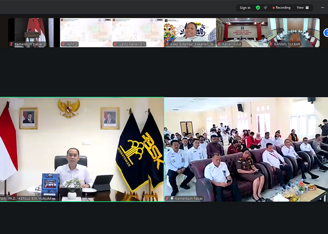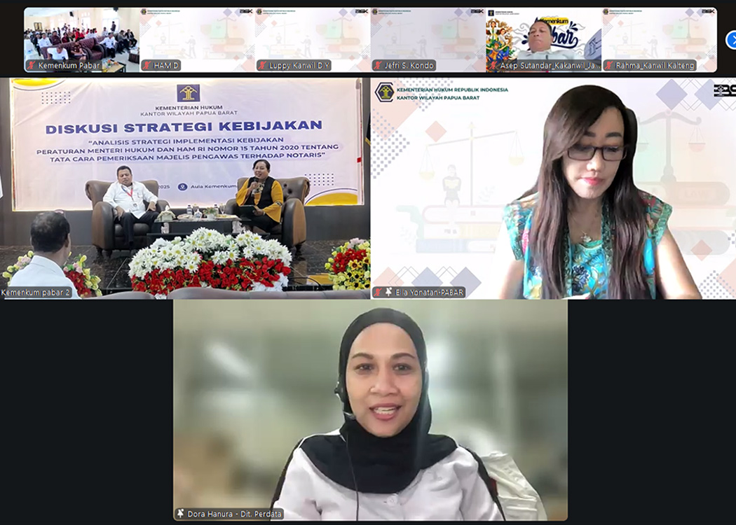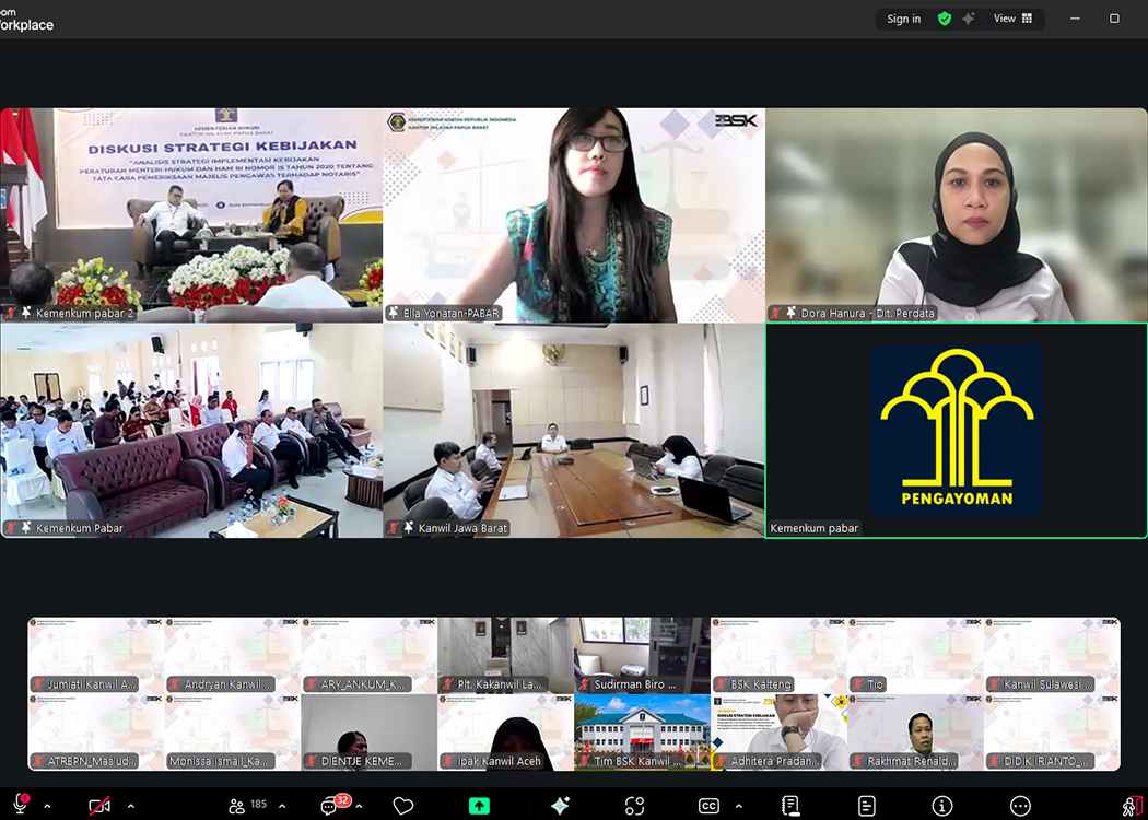 BANDUNG – Kantor Wilayah Kementerian Hukum Jawa Barat (Kanwil Kemenkum Jabar) pada pagi ini mengikuti kegiatan Diskusi Strategi Kebijakan yang diselenggarakan oleh Kanwil Kemenkum Papua Barat bersama Badan Strategi Kebijakan (BSK) Hukum dengan tema “Analisis Strategi Implementasi Kebijakan Permenkumham Nomor 15 Tahun 2020 Tentang Syarat dan Tata Cara Pemeriksaan Majelis Pengawas Terhadap Notaris” (Rabu, 29/10/2025).
