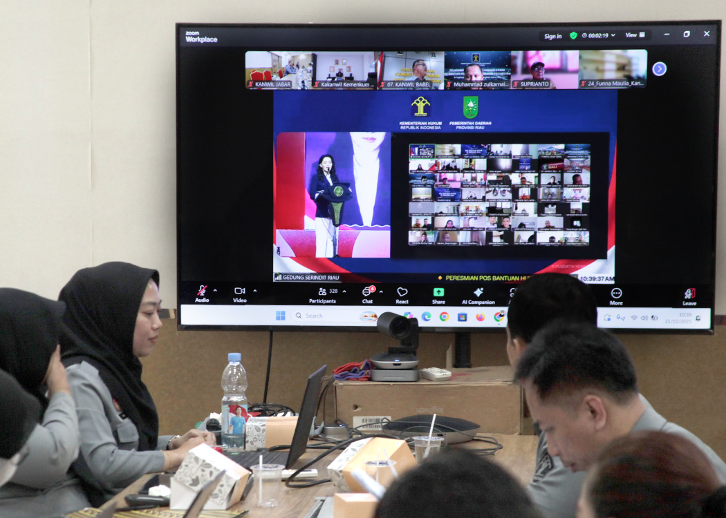 Dari ruang rapat Ismail Saleh, Kepala Divisi P3H Funna Maulia Masaile bersama para Perancang PUU dan Analis Hukum Kanwil Jabar mengikuti jalannya kegiatan peresmian yang berpusat di Gedung Daerah Balai Serindit, Pekanbaru, dan diresmikan secara langsung oleh Menteri Hukum Supratman Andi Agtas dan Gubernur Riau Abdul Wahid.