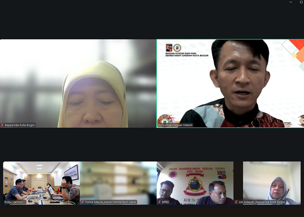 Dari ruang rapat Ismail Saleh, Perancang PUU Madya Harun Surya bersama para Perancang PUU Kanwil Jabar melaksanakan Rapat bersama Perangkat Daerah Pemkot Bogor, Kepala Divisi P3H Funna Maulia Masaile juga turut hadir secara daring dari tempat kerja beliau.