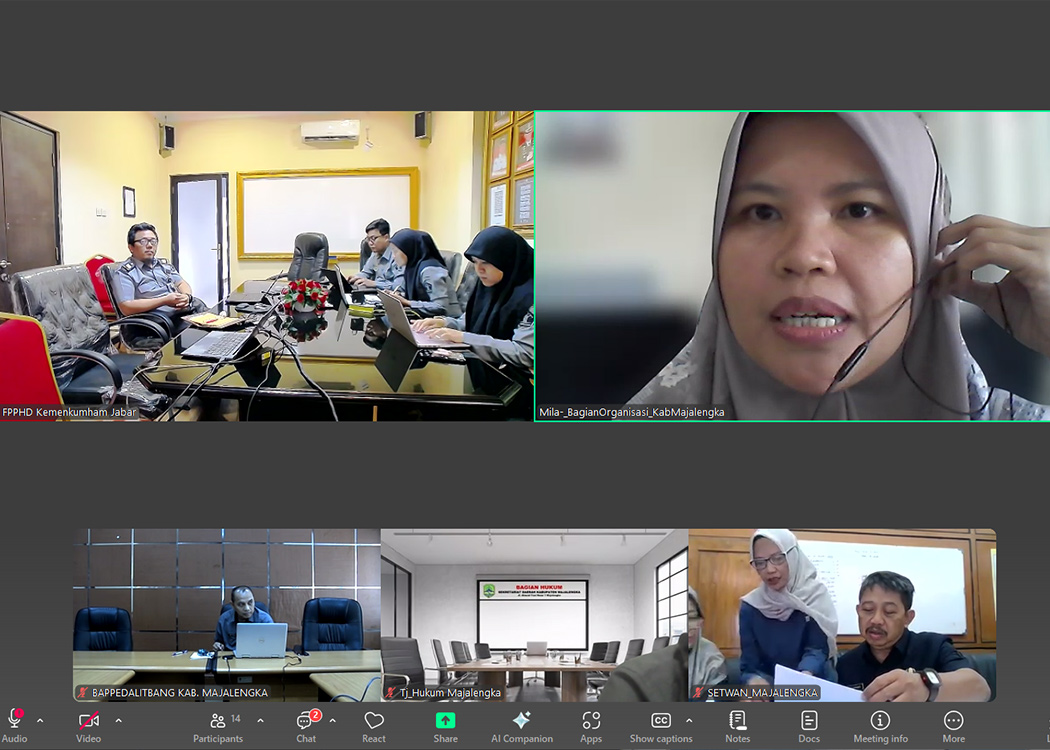 BANDUNG - Kantor Wilayah Kementerian Hukum Jawa Barat (Kanwil Kemenkum Jabar) melalui Divisi P3H pada siang hari ini melaksanakan Rapat Harmonisasi terhadap 4 Rancangan Peraturan Bupati (Raperbup) Kabupaten Majalengka bersama para perwakilan dari Pemerintah Daerah Kabupaten Majalengka (Pemkab Majalengka) secara daring (Selasa, 19/08/2025).