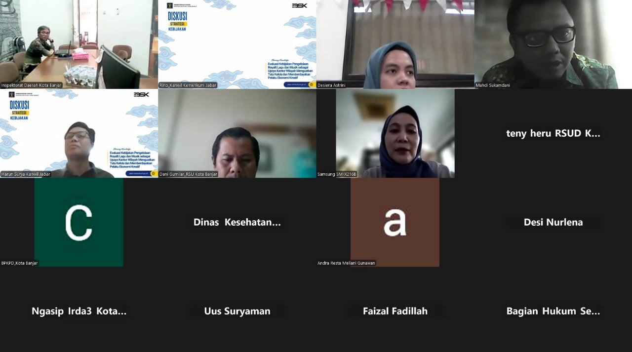 Kepala Divisi P3H Funna Maulia Masaile beserta Perancang Madya Harun Surya dan para Perancang PUU Kanwil Jabar melaksanakan rapat bersama Perangkat Daerah Pemkot Banjar secara virtual dari tempat kerja masing - masing. Dalam rapat kali ini dibahas mengenai Raperda tentang Perubahan Pajak & Retribusi Daerah, Raperwal tentang Pedoman Pengelolaan Pegawai Non-ASN di RSUD, serta Raperwal tentang Pedoman Pengendalian Gratifikasi di lingkungan Pemkot Banjar.