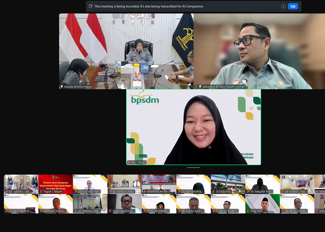 BANDUNG – Kantor Wilayah Kementerian Hukum Jawa Barat (Kanwil Kemenkum Jabar) pada pagi hari ini mengikuti pembukaan kegiatan Pelatihan Teknis Manajemen Kesekretariatan Bagi Kabag TU dan Umum secara daring, pembukaan tersebut merupakan salah satu dari rangkaian kegiatan pelatihan teknis yang diselenggarakan oleh Badan Pembinaan Sumber Daya Manusia (BPSDM) Hukum Kemenkum RI selama 11 hari kedepan (Senin, 25/08/2025).