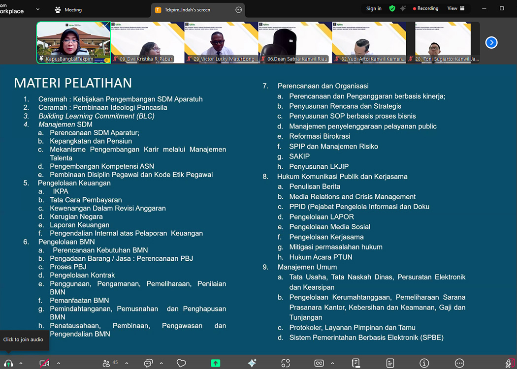 Pelatihan yang akan berlangsung selama 11 hari ini akan diisi dengan berbagai materi seperti manajemen SDM, pengelolaan keuangan, pengelolaan BMN, perencanaan dan organisasi, manajemen hukum, komunikasi publik & kerjasama, manajemen umum, serta manajemen pusat data & informasi terkait SPBE.