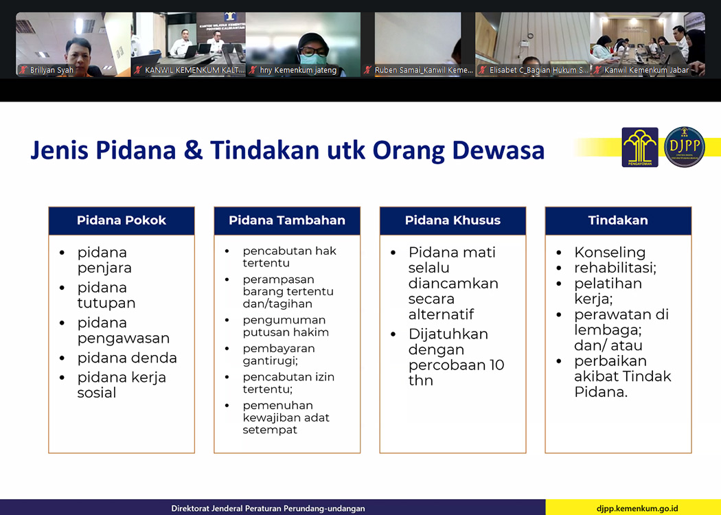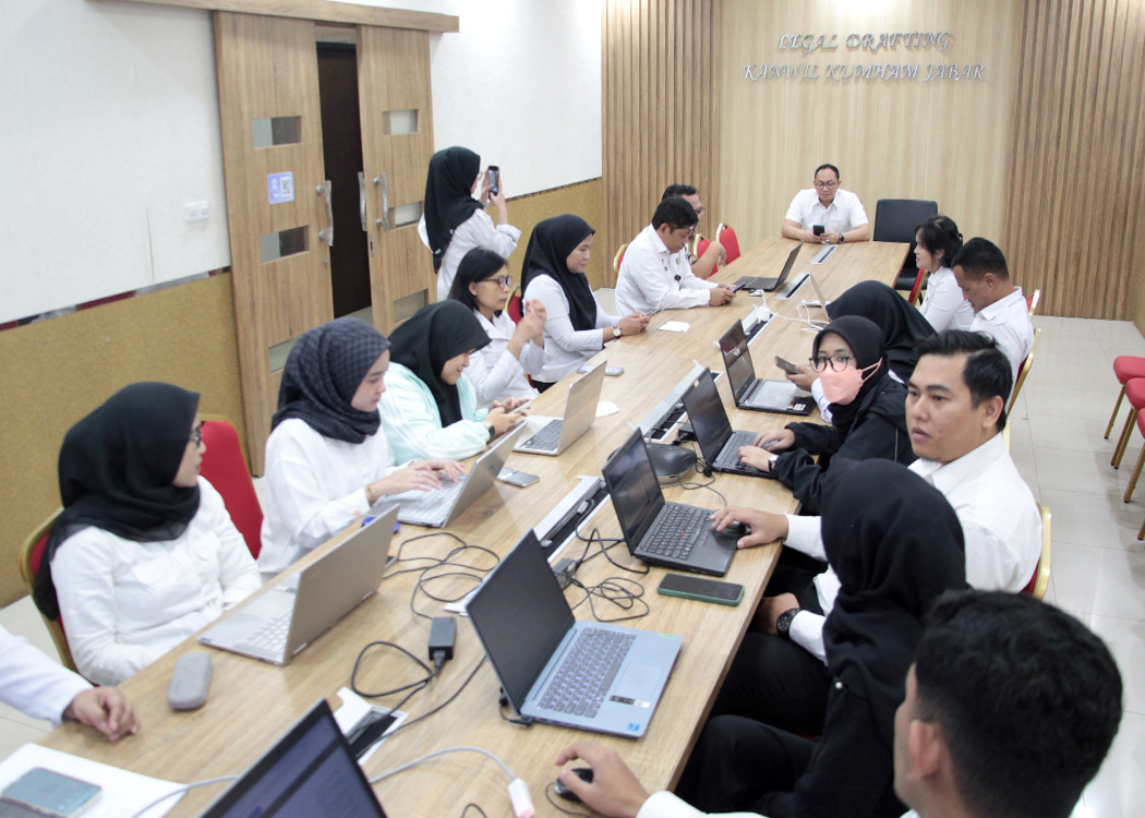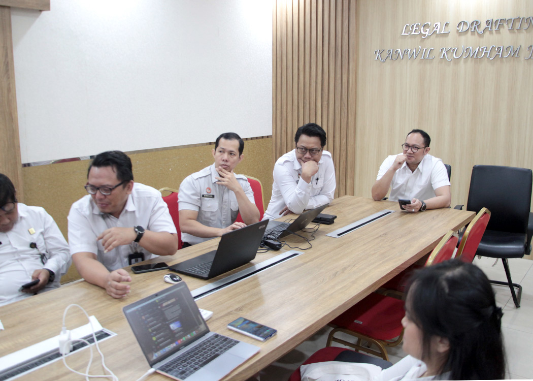 Pada ruang rapat Ismail Saleh, Kanwil Jabar, Kepala Divisi P3H Ferry Gunawan C. bersama para Perancang PP Kanwil Jabar mengikuti jalannya pemaparan yang dibawakan oleh Direktur Jenderal PP Dhahana Putra yang memberikan penjelasan mendalam terkait implikasi pemberlakuan Undang-Undang Penyesuaian Pidana terhadap konstruksi ketentuan pidana dalam Peraturan Daerah, selain itu Kakanwil Asep Sutandar juga turut menyimak pemaparan dari tempat kerja beliau.