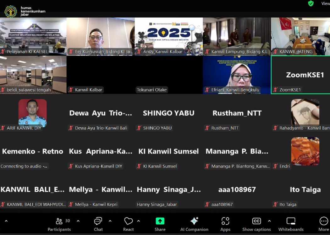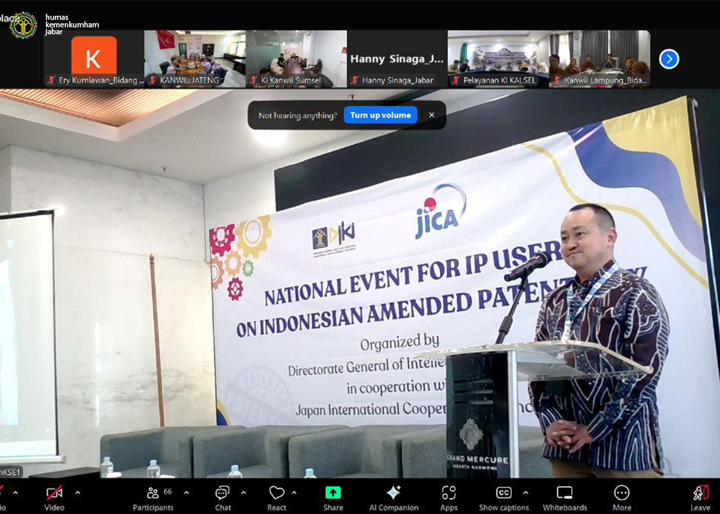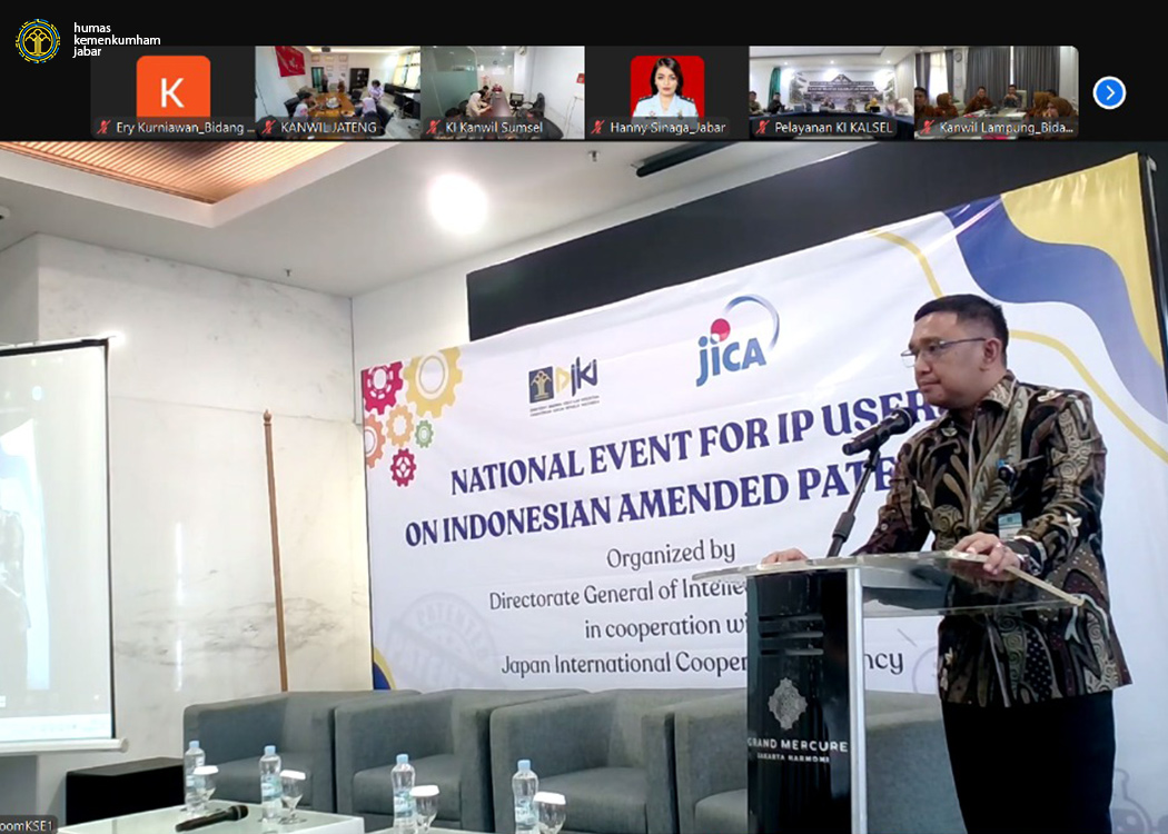 Bandung - Kantor Wilayah Kementerian Hukum Jawa Barat (Kanwil Kemenkum Jabar) menghadiri kegiatan National Event for IP Users on Indonesian Amended Patent Law yang digelar secara hybrid (luring dan daring) oleh Direktorat Jenderal Kekayaan Intelektual (DJKI) bersama Japan International Cooperation Agency (JICA). Kegiatan annual ini diadakan untuk memberikan pengetahuan dan pemahaman bagi pengguna kekayaan intelektual (IP Users) tentang perubahan dalam Undang-Undang Paten (Kamis, 20/02/2025). Kepala Bidang Pelayanan KI Ery Kurniawan turut hadir dari tempat kerja mengikuti kegiatan yang berpusat di Grand Mercure Jakarta Harmoni Hotel.