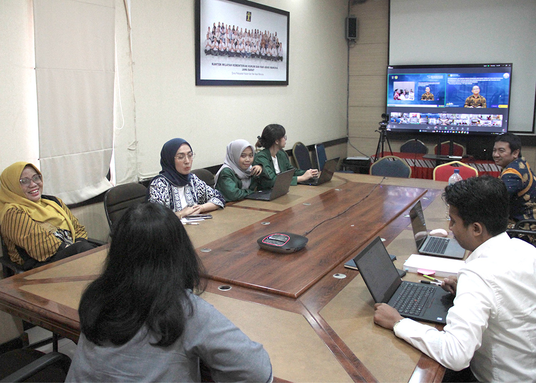 Dari ruang rapat Romli Atmasasmita, Kanwil Jabar, Kepala Bidang Pelayanan AHU Ave Maria Sihombing beserta jajaran pegawai Bidang AHU mengikuti jalannya kegiatan, selain itu Kadiv Pelayanan Hukum Hemawati BR Pandia dari tempat kerja juga turut mengikuti secara daring kegiatan yang berpusat di Kanwil Kemenkum Kepulauan Riau dan diikuti oleh Kanwil Kemenkum dan Kanwil Direktorat Jenderal Pemasyarakatan se-Indonesia.