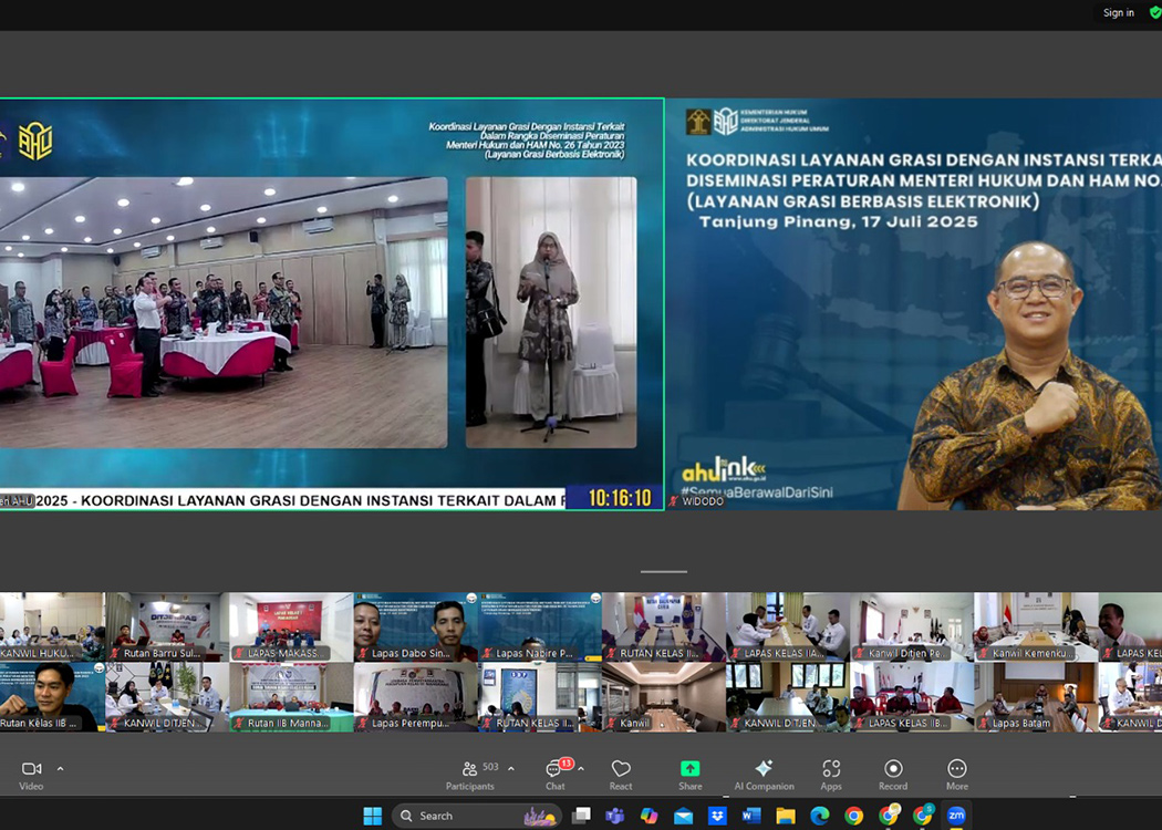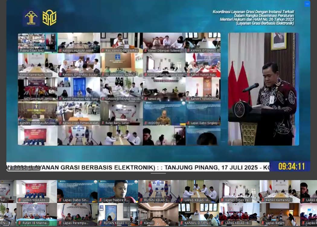 BANDUNG – Kantor Wilayah Kementerian Hukum Jawa Barat (Kanwil Kemenkum Jabar) di bawah arahan Kakanwil Asep Sutandar dan melalui Divisi Pelayanan Hukum oleh Kepala Divisi Hemawati BR Pandia pada pagi hari ini menghadiri kegiatan sosialisasi secara daring yang diselenggarakan oleh Direktorat Jenderal Administrasi Hukum Umum (Ditjen AHU) terkait Koordinasi Layanan Grasi Dengan Instasi Terkait Dalam Rangka Diseminasi Permenkumham No. 26 Tahun 2023 tentang Layanan Grasi Berbasis Elektronik (Kamis, 17/07/2025).
