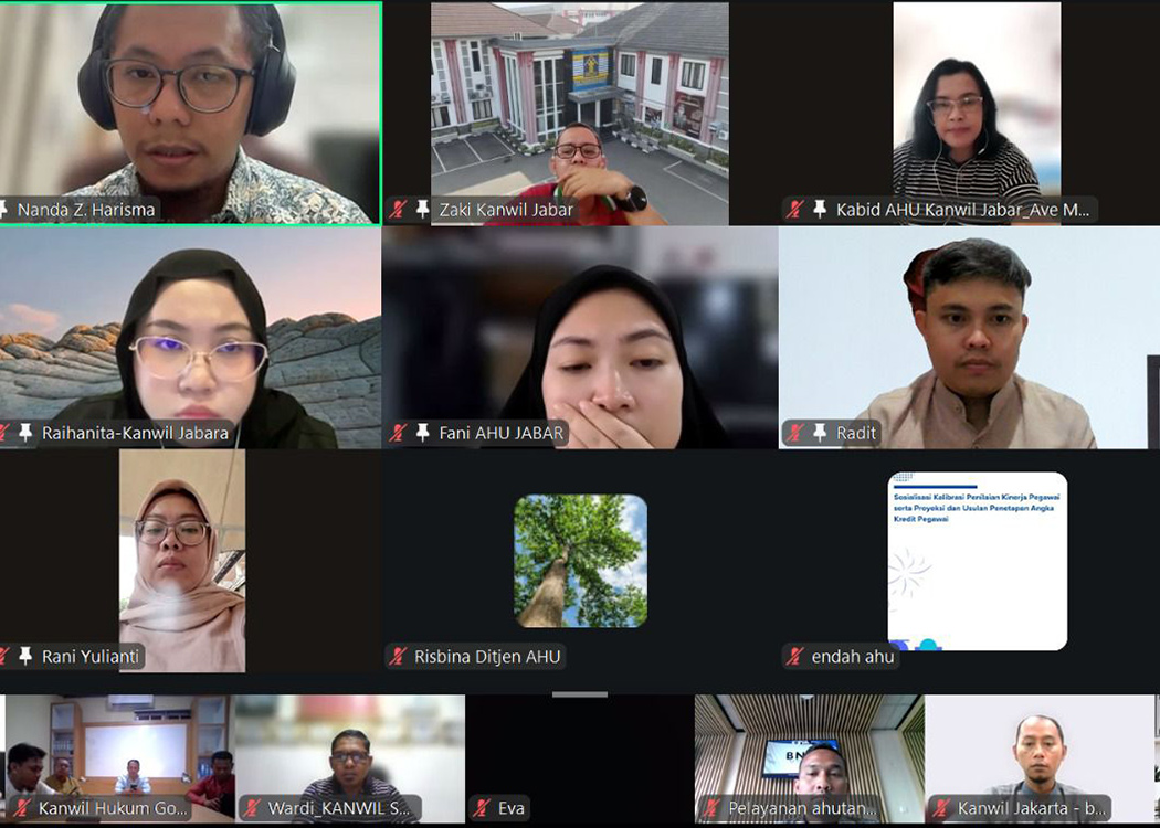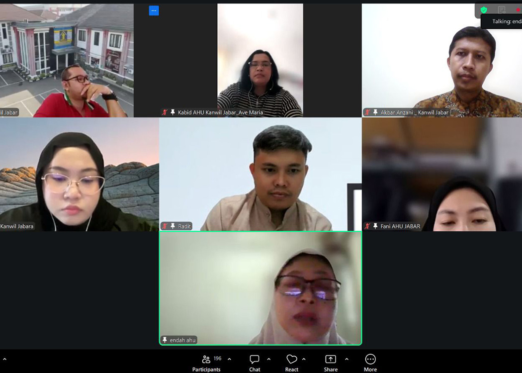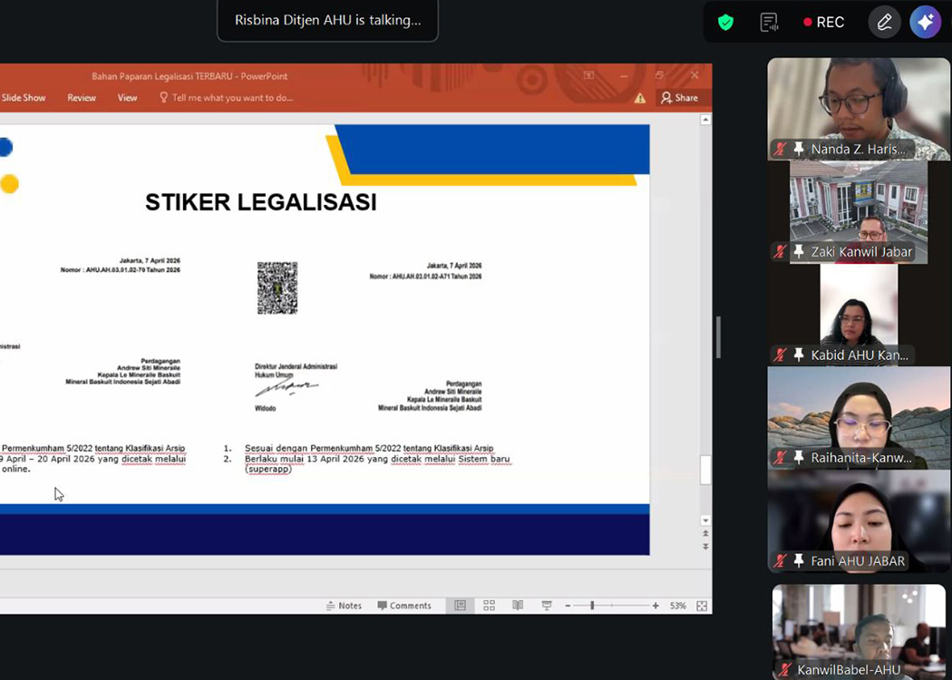 BANDUNG - Kantor Wilayah Kementerian Hukum Jawa Barat (Kanwil Kemenkum Jabar) melalui Bidang Pelayanan Administrasi Hukum Umum (AHU) mengikuti Sosialisasi Penggunaan Rebuild Aplikasi Legalisasi – Apostille, yang diselenggarakan secara daring melalui Zoom Meeting (Jumat, 10/04/2026). Dari masing - masing tempat kerja, Kepala Bidang Pelayanan AHU Ave Maria Sihombing bersama jajaran Bidang AHU Kanwil Jabar mengikuti sosialisasi layanan Apostille yang diselenggaraka oleh Direktorat Jenderal AHU.