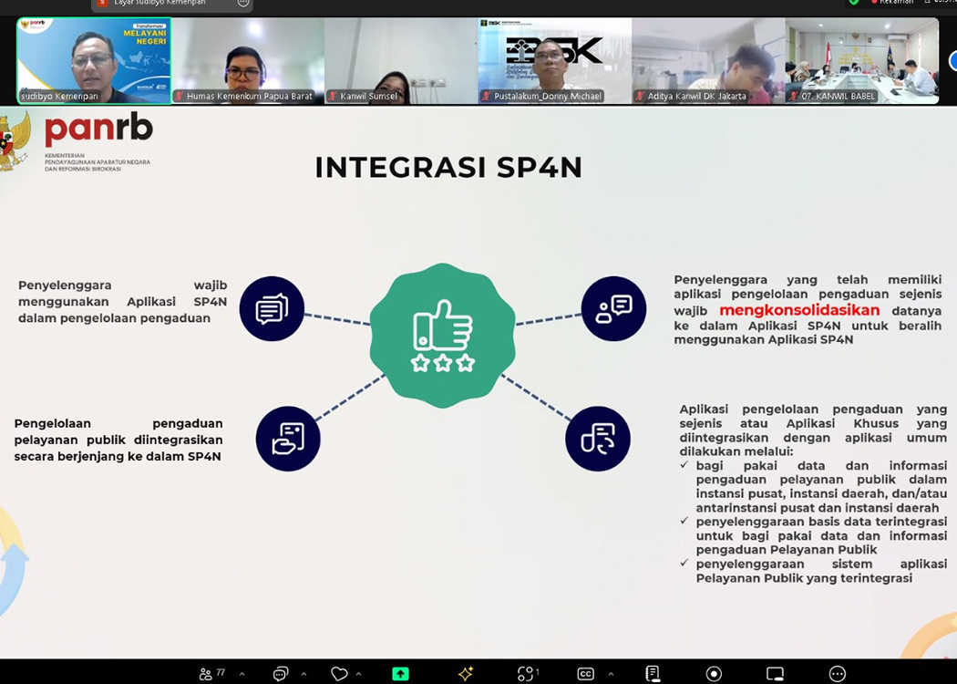 BANDUNG – Kantor Wilayah Kementerian Hukum Jawa Barat (Kanwil Kemenkum Jabar) pada pagi ini mengikuti jalannya kegiatan Sosialisasi PermenPAN-RB Nomor 5 Tahun 2025 tentang Penyelenggaraan Sistem Pengelolaan Pengaduan Pelayanan Publik Nasional (SP4N) yang diselenggarakan oleh Badan Strategi Kebijakan (BSK) Kemenkum RI secara daring melalui Zoom Meeting (Kamis, 11/12/2025).