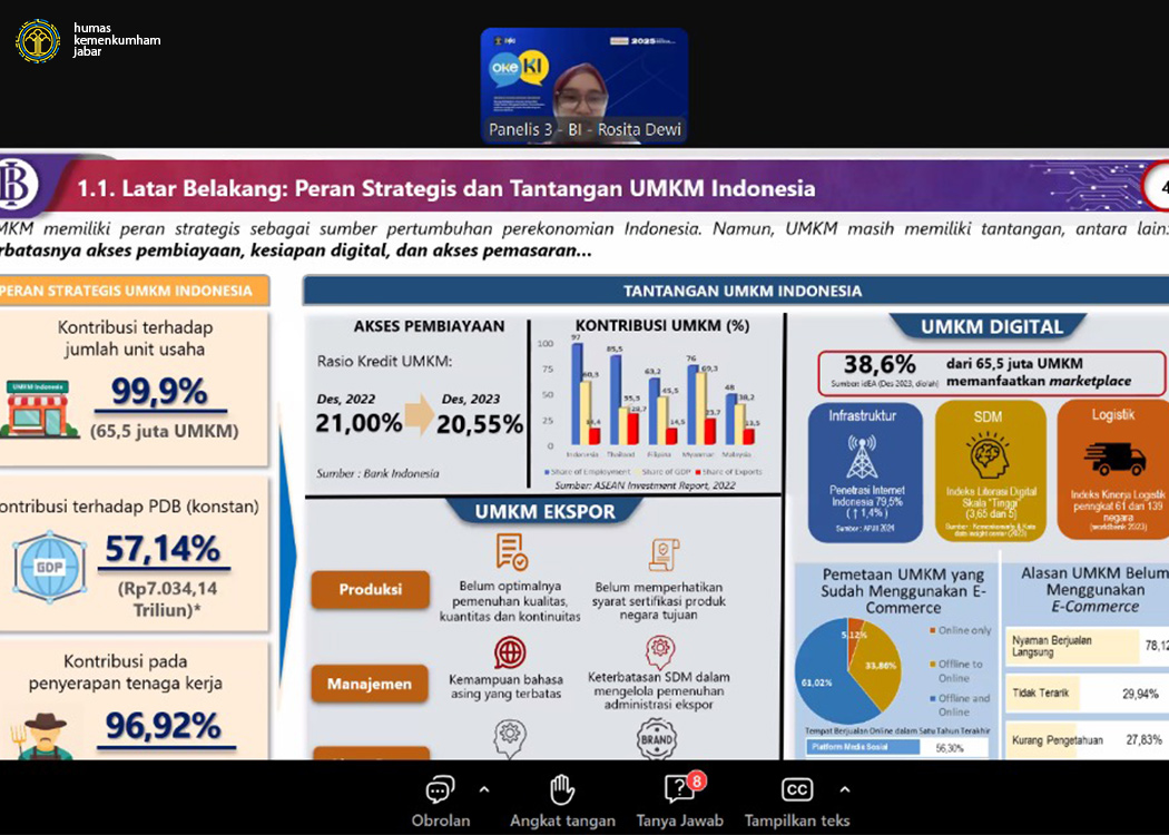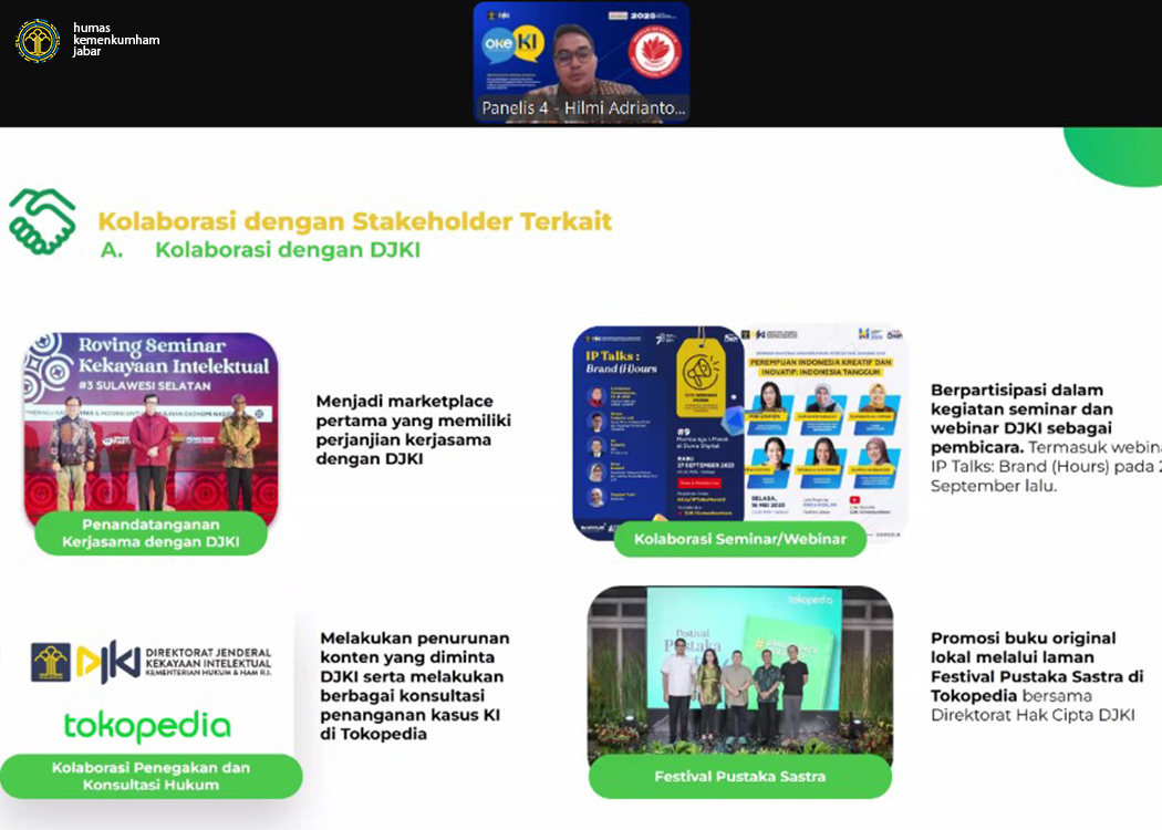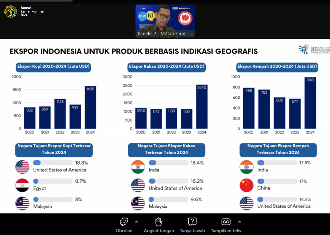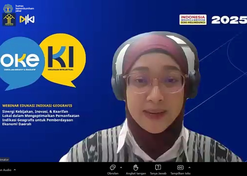 Bandung - Dalam upaya meningkatkan pemahaman dan pemanfaatan Indikasi Geografis sebagai instrumen strategis dalam pemberdayaan ekonomi daerah, Direktorat Jenderal Kekayaan Intelektual (DJKI) Kementerian Hukum Republik Indonesia menyelenggarakan Webinar Indikasi Geografis dengan tema "Sinergi Kebijakan, Inovasi, dan Kearifan Lokal dalam Mengoptimalkan Pemanfaatan Indikasi Geografis untuk Pemberdayaan Ekonomi Daerah" secara daring melalui Zoom Meeting yang yang memasuki hari ke-2 (Kamis, 27/02/2025).