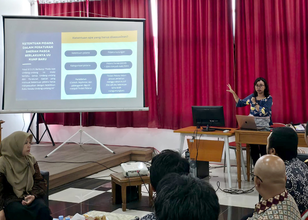 Kadiv Funna juga menyampaikan KUHP baru memerlukan perhatian khusus dari Pemda karena sejumlah ketentuan pidana di tingkat daerah akan terdampak dan perlu disesuaikan. Penyesuaian tersebut mencakup perubahan kategori pidana, struktur pidana denda, ketentuan pidana kurungan, peristilahan baru, hingga pengaturan tindak pidana dalam proses peradilan yang kini mengacu pada KUHP baru. Dalam hal ini Pemda dianjurkan melakukan penelaahan awal terhadap seluruh peraturan daerah yang memuat ketentuan pidana untuk mengidentifikasi regulasi yang membutuhkan pembaruan.