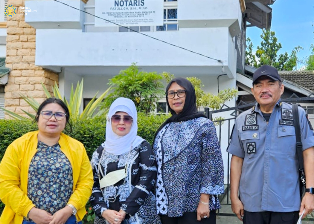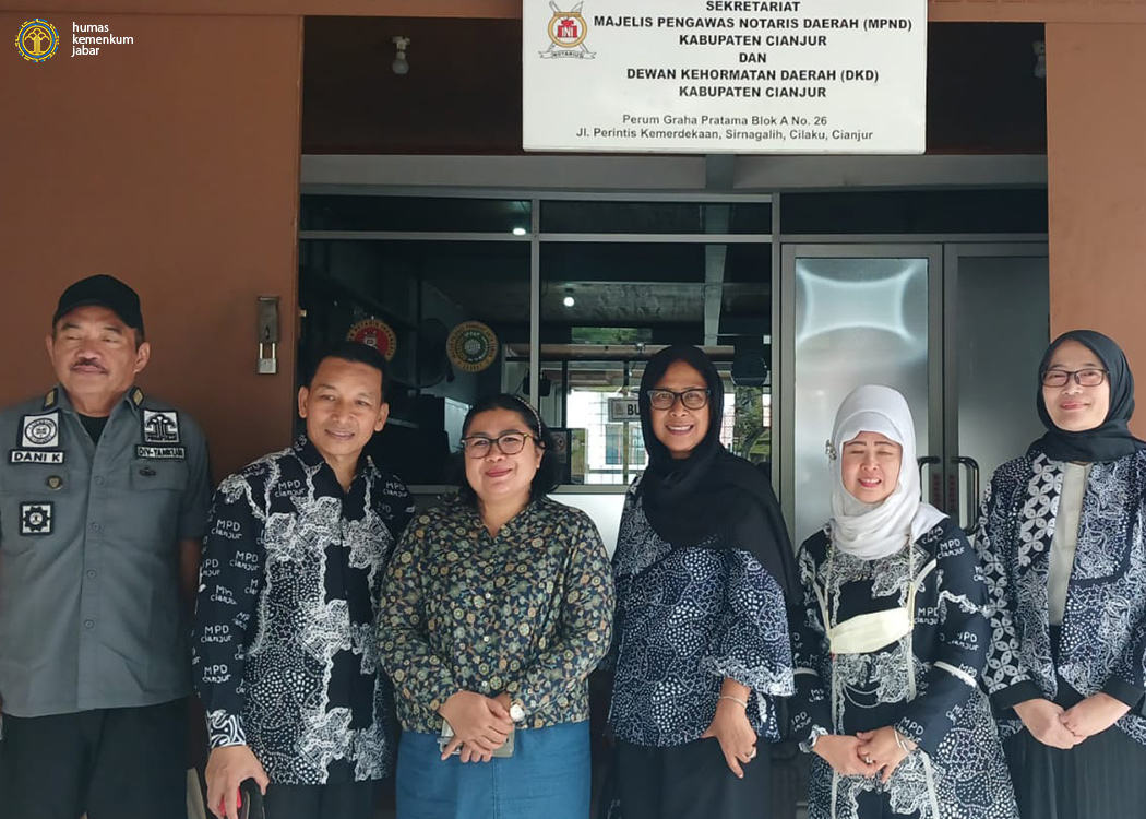 Kab. Cianjur - Kantor Wilayah Kementerian Hukum Jawa Barat (Kanwil Kemenkum Jabar) pada hari ini melaksanakan kegiatan Pemeriksaan terhadap kantor notaris dan Pembinaan terhadap anggota Majelis Pengawas Daerah (MPD) yang bertempat di Kabupaten Cianjur (Rabu, 26/03/2025). Kegiatan kali ini dilaksanakan oleh Kepala Divisi Pelayanan Hukum Hemawati BR Pandia, Analis Hukum Dani Kusmawan dan Penyuluh Hukum Endang Uminarsih selaku anggota MPD unsur pemerintahan.