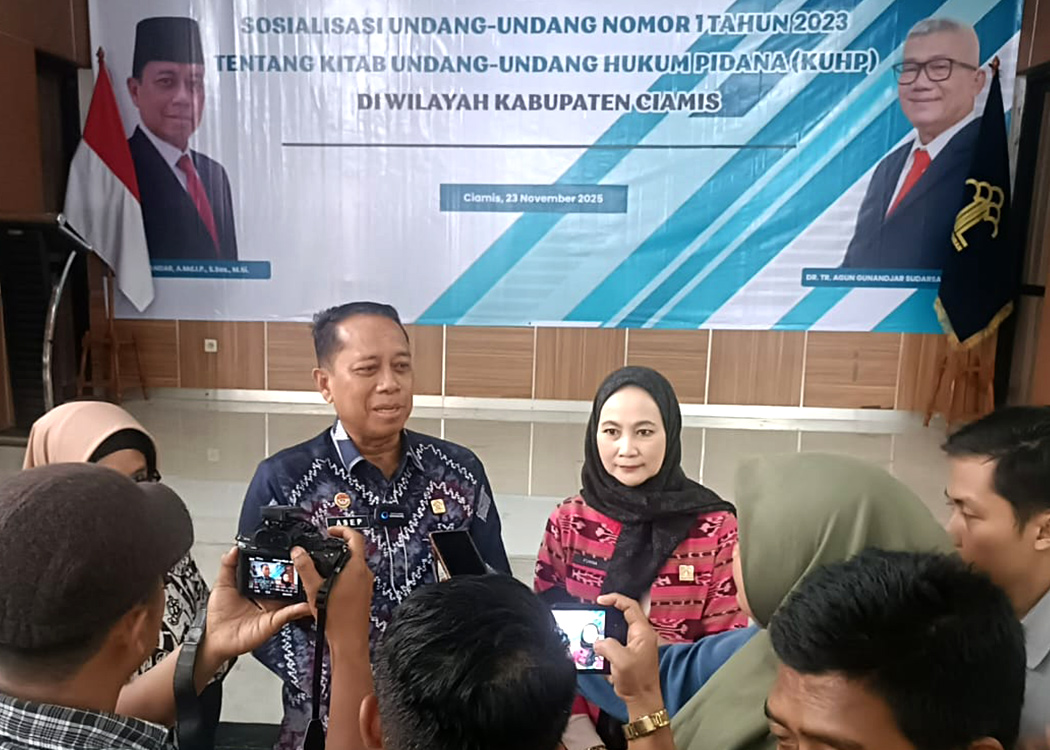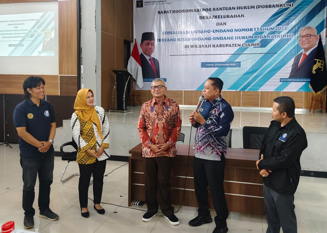 Kabupaten Ciamis - Kepala Kantor Wilayah Kementerian Hukum Jawa Barat (Kakanwil Kemenkum Jabar) Asep Sutandar bersama Kepala Divisi Peraturan Perundang-undangan dan Pembinaan Hukum (P3H) Funna Maulia Masaile dan para Penyuluh Hukum Kanwil Jabar pada hari melaksanakan Rapat Koordinasi Pelaksanaan Pos Bantuan Hukum (Posbankum) Desa/Kelurahan dan Sosialisasi Undang-Undang Nomor 1 Tahun 2023 tentang KUHP yang bertempat di Aula Dinas Pendidikan Kabupaten Ciamis (Minggu, 23/11/2025).