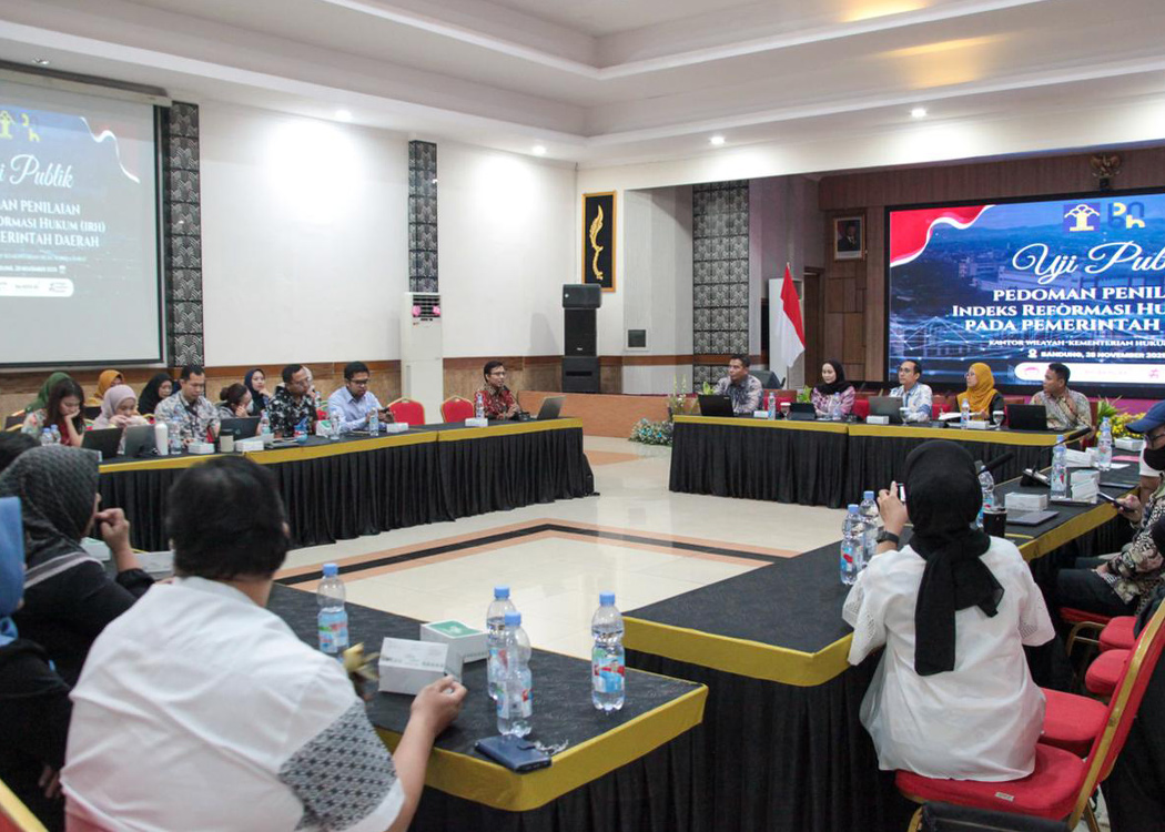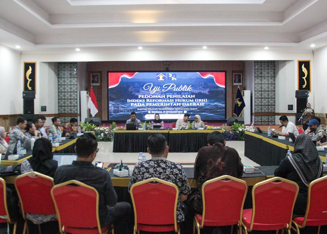 BANDUNG - Kantor Wilayah Kementerian Hukum Jawa Barat (Kanwil Kemenkum Jabar) pada hari ini menyelenggarakan kegiatan Uji Publik Pedoman Pelaksanaan Penilaian Indeks Reformasi Hukum (IRH) pada Pemerintah Daerah yang bertempat di aula Soepomo. Kegiatan yang diselenggarakan bersama Badan Pembinaan Hukum Nasional (BPHN) ini bertujuan untuk menyamakan pandangan antara BPHN dan Pemda di wilayah Jawa Barat terkait penilaian IRH (Jumat, 28/11/2025).