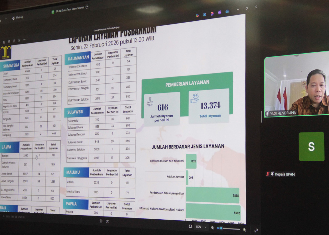 Sementara itu dalam rapat persiapan daring bersama BPHN disampaikan bahwa hingga saat ini capaian pelaporan baru mencapai 13.374 laporan, sehingga masih perlunya upaya percepatan laporan pelayanan Posbankum secara masif dari seluruh Kantor Wilayah se-Indonesia.