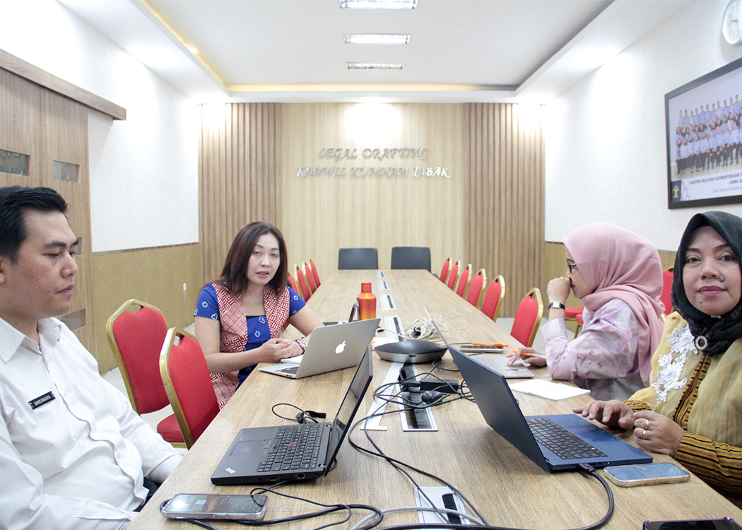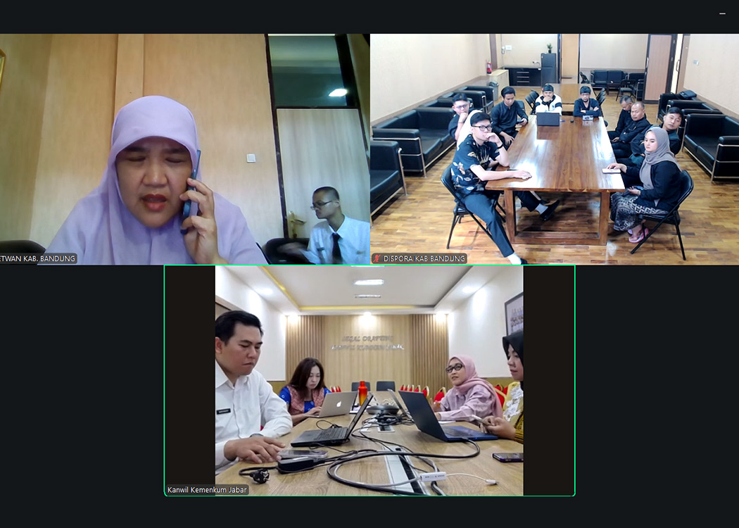 Dari ruang rapat Ismail Saleh, Kanwil Jabar, Perancangan Peraturan Perundang-undangan (PP) Shendy Sheldon bersama para Perancang PP Kanwil Jabar melaksanakan rapat bersama Sekretariat Daerah Kab. Bandung dan Dispora Bandung melalui Zoom membahas Raperda perubahan tentang Penyelenggaraan Keolahragaan Daerah.