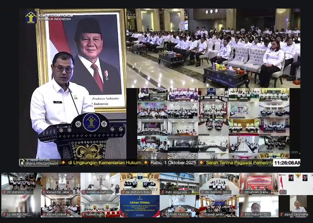 BANDUNG – Kantor Wilayah Kementerian Hukum Jawa Barat (Kanwil Kemenkum Jabar) pada pagi hari ini menghadiri jalannya kegiatan Serah Terima Pegawai Pemerintah dengan Perjanjian Kerja (PPPK) di Lingkungan Kementerian Hukum Tahun Anggaran 2024 yang diselenggarakan oleh Sekretariat Jenderal Kemenkum RI secara virtual melalui Zoom Meeting (Rabu, 01/01/2025).