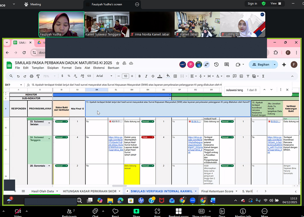 Dalam kegiatan hari ini, Tim Maturitas KI Jawa Barat melakukan penelaahan menyeluruh terhadap seluruh indikator penilaian. Tim memeriksa kembali data dan dokumen pendukung, mengidentifikasi indikator yang memerlukan perbaikan, dan langsung melakukan penyesuaian yang diperlukan.