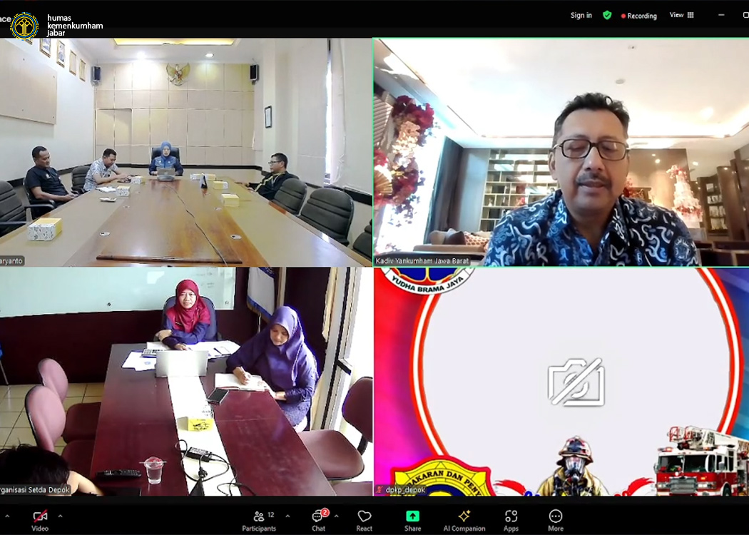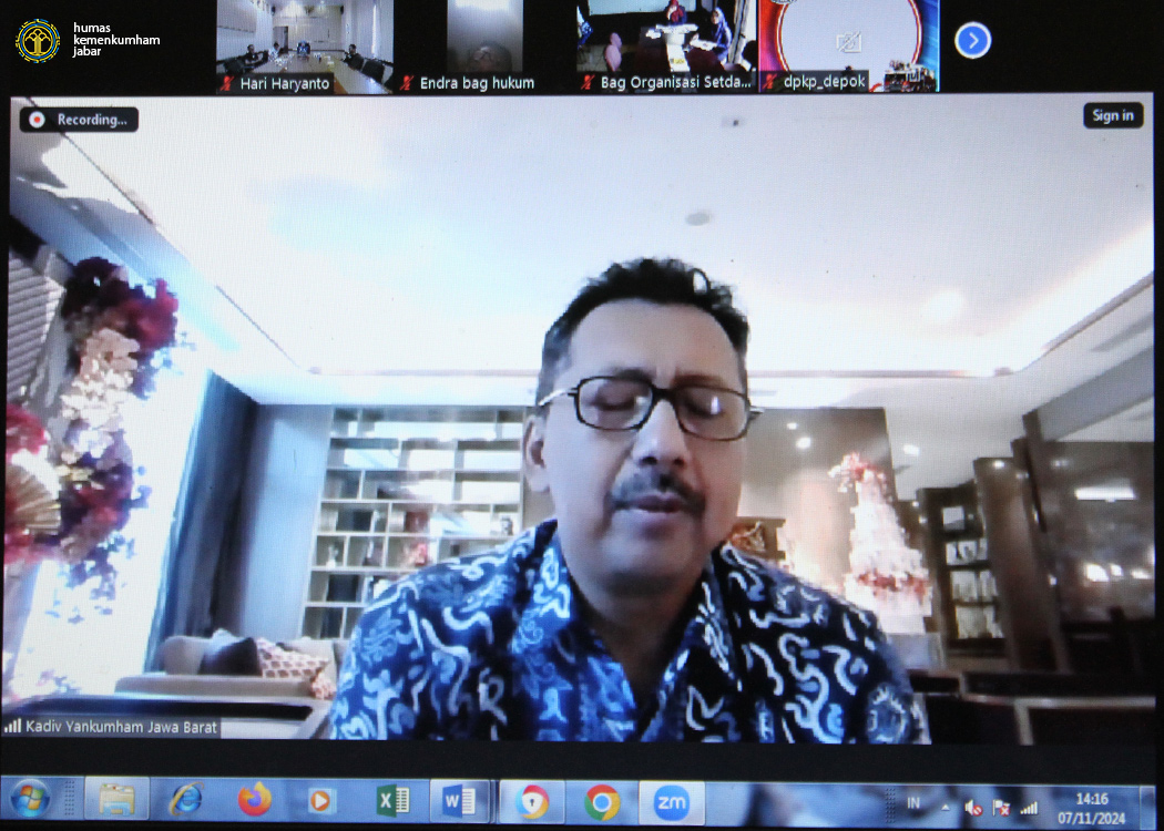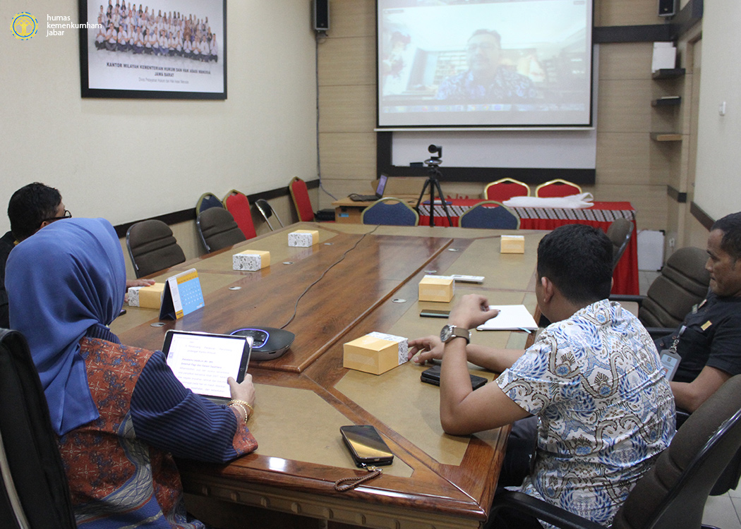Dari ruang rapat Romli Atmasasmita, Kanwil Jabar, Kepala Bidang Hukum Lina Kurniasari beserta para Perancang PUU Kanwil Jabar melaksanakan rapat pembahasan, sementara itu Kepala Divisi Pelayanan Hukum dan HAM Andrieansjah juga turut hadir secara virtual dari tempat kerja membuka kegiatan yang dilaksanakan bersama Perangkat Daerah Pemkot Depok.