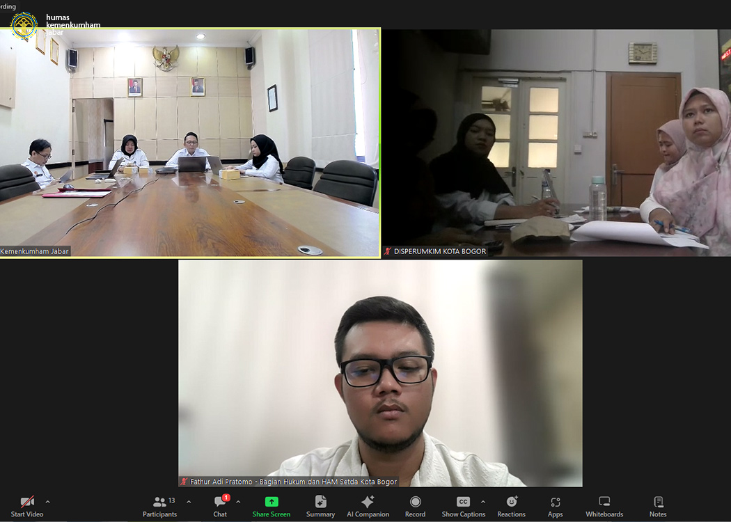 BANDUNG – Kantor Wilayah Kementerian Hukum dan HAM Jawa Barat (Kanwil Kemenkumham Jabar) pada pagi ini melaksanakan Rapat Harmonisasi terhadap 2 Rancangan Peraturan Wali Kota (Raperwal) Bogor secara daring melalui Zoom Meeting bersama dengan Pemerintah Kota Bogor (Rabu, 04/09/2024).