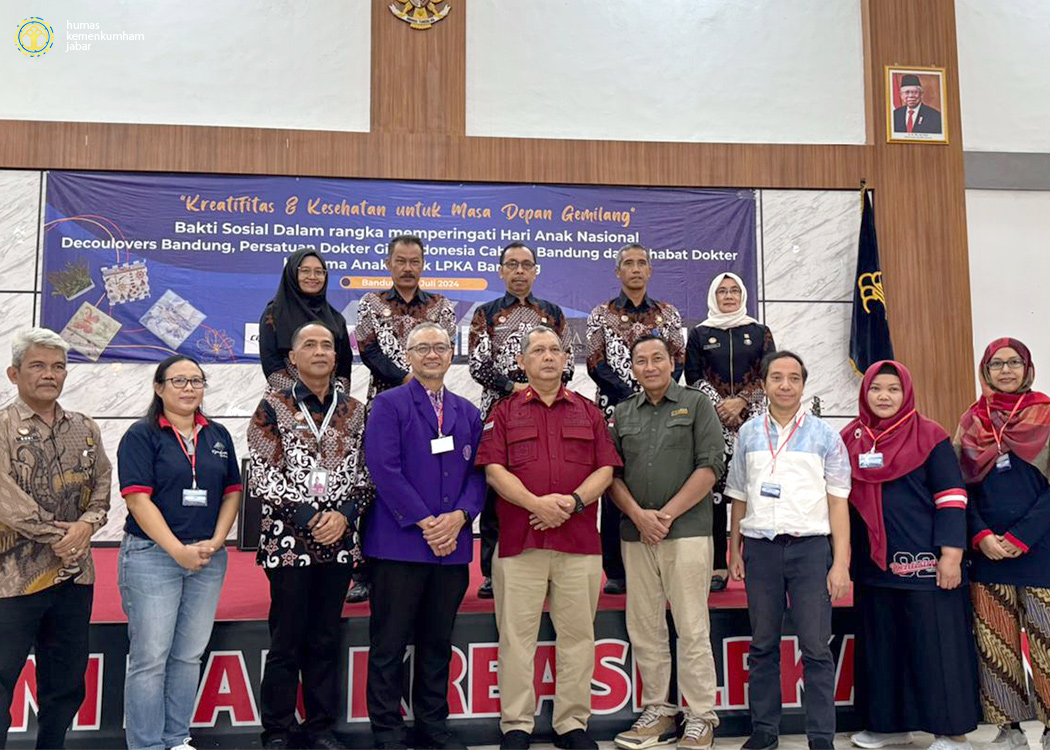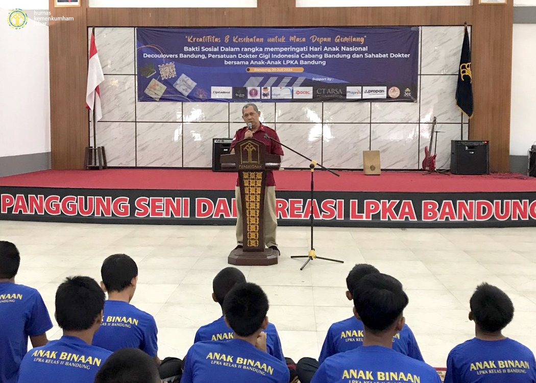 BANDUNG - Dalam rangka memperingati Hari Anak Nasional, Kepala Divisi Pemasyarakatan Kantor Wilayah Kementerian Hukum dan HAM Jawa Barat (Kadivpas Kanwil Kemenkumham Jabar) Robianto menghadiri Pembukaan Kegiatan Bakti Sosial yang diselenggarakan oleh lembaga Pembinaan Khusus Anak (LPKA) Bandung bekerja sama dengan Decoulovers Bandung, Persatuan Dokter Gigi Indonesia Cabang Bandung dan Sahabat Dokter (Sabtu, 20/07/2024).