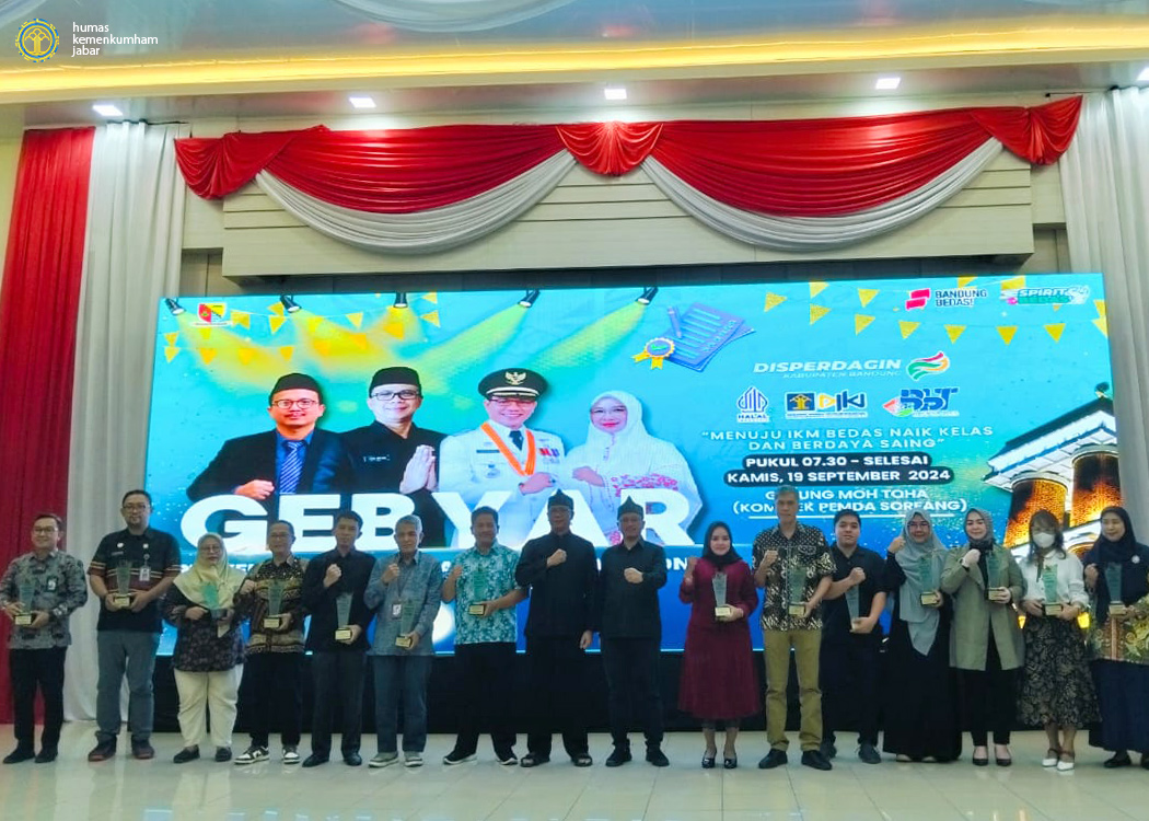Kabupaten Bandung - Kantor Wilayah Kementerian Hukum dan HAM Jawa Barat (Kanwil Kemenkumham Jabar) menghadiri kegiatan Gebyar Penyerahaan Sertifikat HKI, Halal, TKDN, Bisnis Matching dan Kurasi serta Penyerahaan Penghargaan terhadap Stakeholder Pemerintahan Daerah Kabupaten Bandung yang bertempat di Gedung Moh. Toha (Komplek Pemda Soreang), Kabupaten Bandung (Kamis, 19/09/2024).