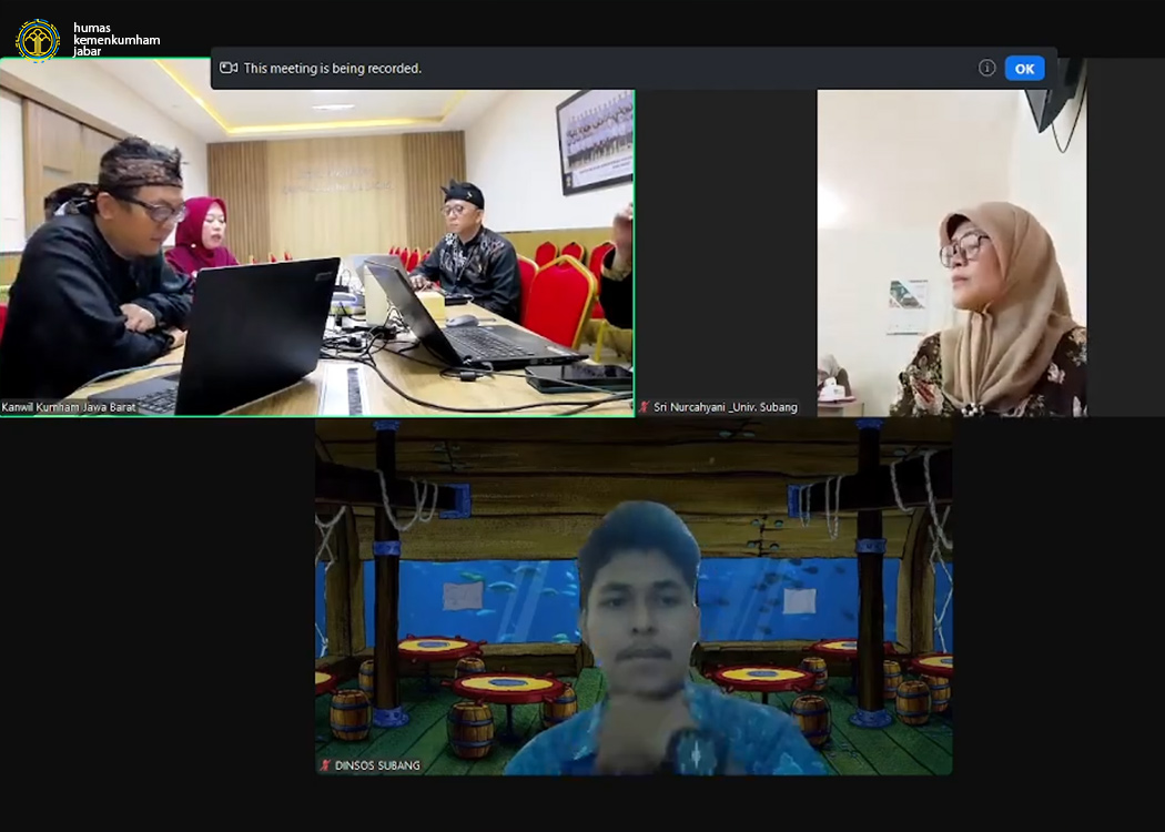 Dari ruang rapat Ismail Saleh, Kanwil Jabar, Kepala bidang Hukum Lina Kurniasari bersama Perancang PUU Madya Ery Kurniawan dan Perancang PUU Kanwil Jabar lainnya melaksanakan rapat pembahasan bersama jajaran Perangkat Daerah Pemkab Subang untuk membahas Raperda tentang Penyelenggaraan Perlindungan dan Pemenuhan Hak Penyandang Disabilitas.