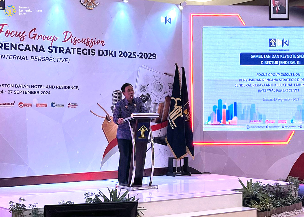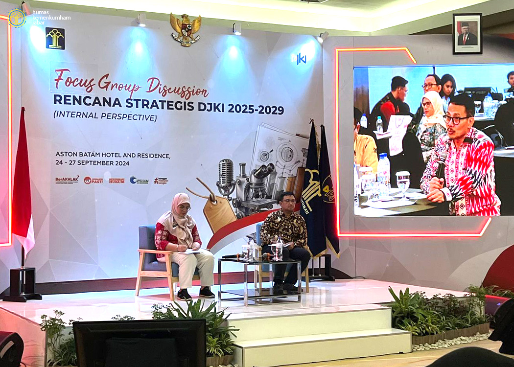 Batam - Menindaklanjuti arahan dan instruksi Kepala Kantor Wilayah Kementerian Hukum dan HAM Jawa Barat Masjuno, Kepala Divisi Pelayanan Hukum dan HAM Andrieansjah, bersama Kepala Bidang Pelayanan Hukum Ave Maria Sihombing, Kepala Sub Bidang Pelayanan Kekayaan Intelektual, Dona Prawisuda, beserta Analis Kekayaan Intelektual memenuhi undangan Kegiatan Focus Group Discussion Rencana Strategis DJKI 2025-2029 (Internal Perspective) yang diselenggarakan oleh Direktorat Jenderal Kekayaan Intelektual (DJKI) Kementerian Hukum dan HAM R.I. bertempat di Aston Batam Hotel and Residence (24/09/24).