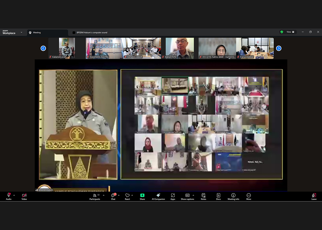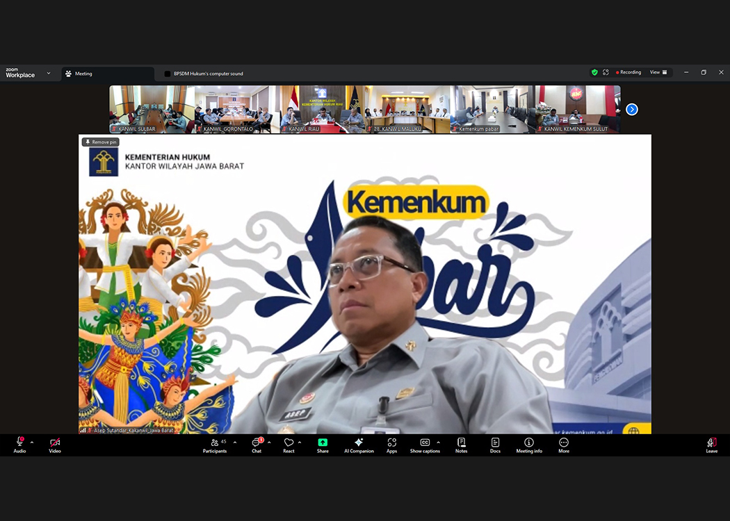 Kanwil Kemenkum Jabar turut berpartisipasi aktif dalam pembukaan pelatihan strategis ini. Kepala Kantor Wilayah Kemenkum Jabar, Asep Sutandar, didampingi jajaran Divisi P3H, mengikuti seluruh rangkaian acara pembukaan secara daring melalui aplikasi Zoom dari Ruang Rapat Saharjo, Bandung. Kehadiran ini menegaskan komitmen Kemenkum Jabar untuk menyukseskan program prioritas nasional dalam reformasi hukum.