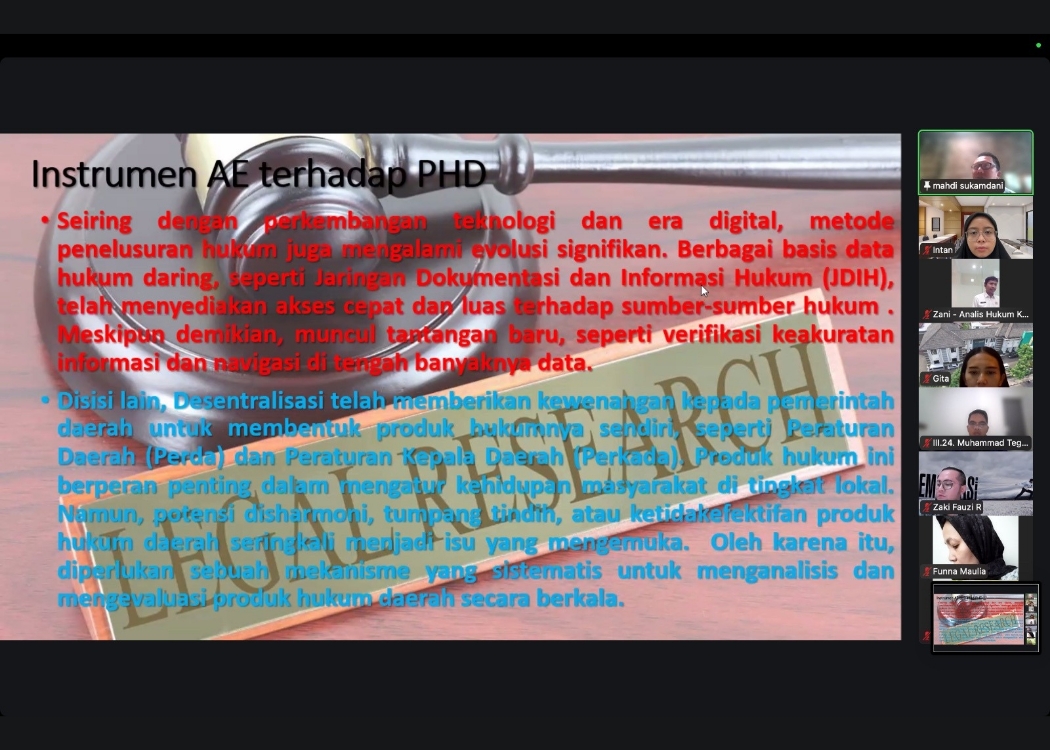 Tampil sebagai narasumber, Perancang Peraturan Perundang-undangan Ahli Muda, Raden Mahdi Sukamdani, memaparkan secara mendalam peran strategis penelusuran hukum. Menurutnya, penelusuran hukum bukan hanya proses mencari dasar argumentasi, tetapi juga instrumen vital untuk menganalisis dan mengevaluasi produk hukum daerah. Di tengah tantangan era digital dan desentralisasi yang berpotensi menimbulkan disharmoni peraturan, ia menyoroti pentingnya evaluasi sistematis yang merujuk pada Surat Keputusan Kepala BPHN Nomor PHN-HN.01.03-07 Tahun 2019.
