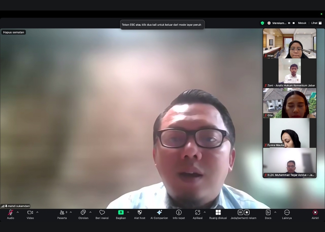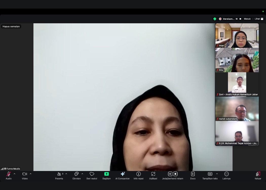 BANDUNG – Kantor Wilayah Kemenkum Jawa Barat di bawah kepemimpinan Kepala Kantor Wilayah, Asep Sutandar, terus berkomitmen meningkatkan kualitas produk hukum daerah. Sebagai wujud komitmen tersebut, diselenggarakan Forum Nongki Santai (Ngobrol Kolaborasi Saling Tukar Ilmu) bertajuk "Penelusuran Hukum sebagai Instrumen Analisis dan Evaluasi terhadap Produk Hukum Daerah” secara virtual melalui Zoom Meeting pada Jumat, 03 Oktober 2025. Kegiatan ini diikuti oleh jajaran analis hukum, perancang perundang-undangan, serta CPNS Kekayaan Intelektual di lingkungan Kanwil Kemenkum Jawa Barat.