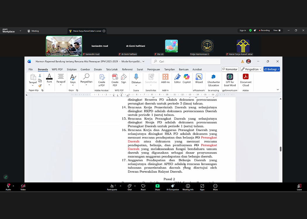 Rapat yang berlangsung di Bandung, Selasa (4/11/2025), dipimpin oleh Plh. KadivP3H Kemenkum Jabar, Harun Surya, didampingi oleh Tim Kelompok Kerja (Pokja) Harmonisasi 2. Turut hadir perwakilan dari berbagai instansi Pemerintah Kota Bandung, meliputi Dinas Perhubungan, Dinas Tenaga Kerja, Dinas Kesehatan, Badan Kepegawaian dan Pengembangan Sumber Daya Manusia (BKPSDM), serta Bagian Tata Pemerintahan dan Bagian Hukum Sekretariat Daerah Kota Bandung.