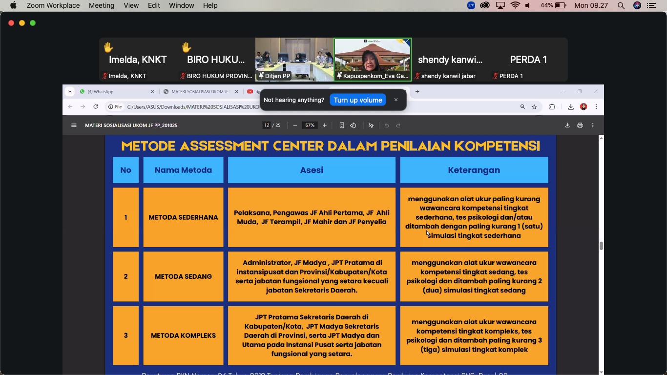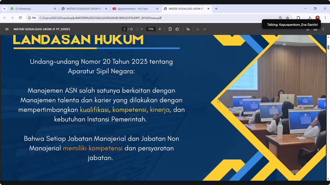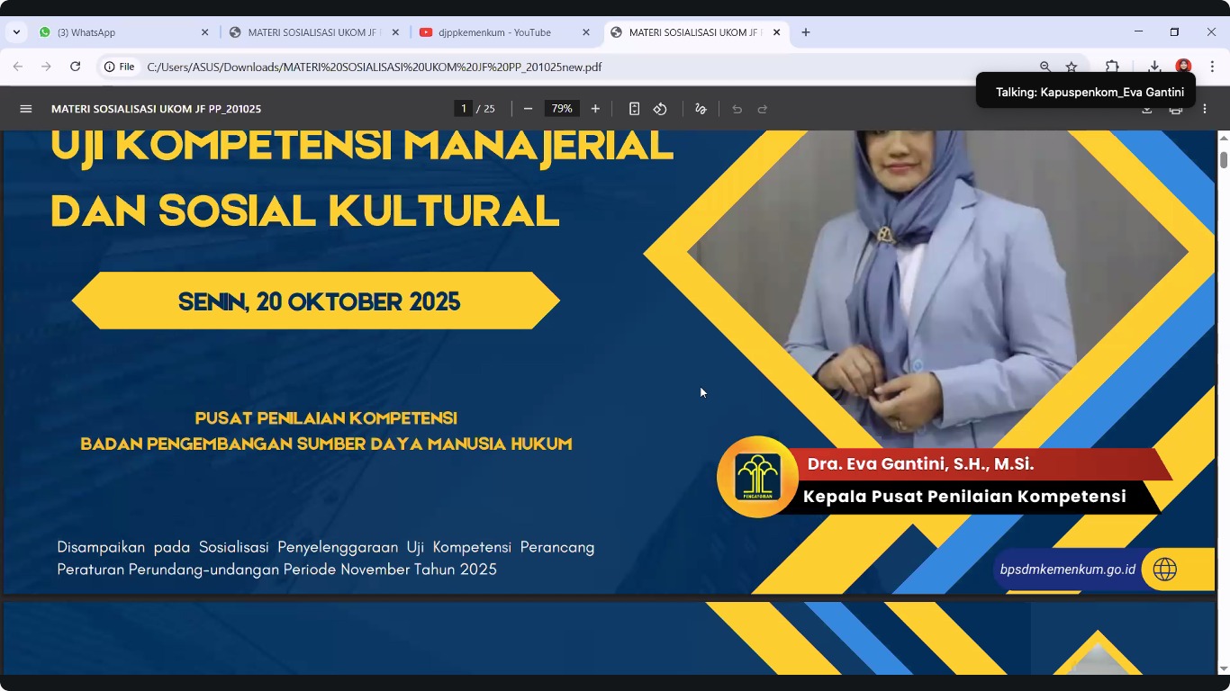 Acara inti sosialisasi menghadirkan tiga narasumber utama dari Badan Pengembangan Sumber Daya Manusia (BPSDM), Pusat Data dan Teknologi Informasi (Pusdatin), serta Direktorat Fasilitasi Perancangan Peraturan Daerah dan Pembinaan Perancang Peraturan Perundang-undangan, yang memaparkan teknis pelaksanaan uji kompetensi manajerial dan sosial kultural.
